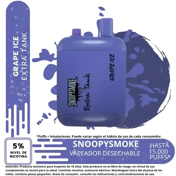 Snoopy Smoke Extra Tank 2 15000 Desechable Características: – Capacidad precargada: 18mL x 2 – Capacidad de la batería: 650mAh – Max Puffs: 15000 – Potencia de nicotina: 5% (50mg) – Funcionamiento: Activado por tiro – Elemento calefactor: Bobina de malla – Carga: Puerto Tipo-C