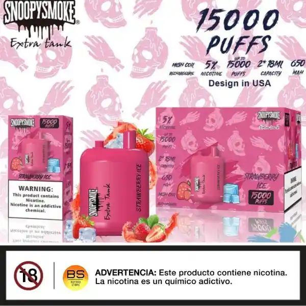 El vaporizador SnoopySmoke de 15.000 puffs es un dispositivo desechable que ofrece una experiencia de vapeo prolongada y satisfactoria. A continuación, te presento algunas características y beneficios clave: - Capacidad y rendimiento: - Hasta 15.000 puffs por dispositivo, lo que garantiza una experiencia prolongada y sin interrupciones - Contiene una cantidad considerable de e-líquido con una variedad de sabores y niveles de nicotina - Diseño y batería: - Batería integrada de alta capacidad para soportar la larga duración del dispositivo - Diseño ergonómico y portátil para facilitar su uso en cualquier momento - Ventajas: - Larga duración y gran cantidad de puffs por dispositivo - No requiere recarga, lo que lo hace ideal para uso en movimiento - Amplia variedad de sabores y opciones para elegir - Colaboración: - La marca SnoopySmoke sugiere una posible colaboración con el famoso rapero Snoop Dogg, lo que podría aportar experiencia y calidad al producto - Consideraciones: - Es importante seguir las instrucciones de uso y mantenimiento para garantizar la seguridad y longevidad del dispositivo En general, el vaporizador SnoopySmoke de 15.000 puffs parece ser una excelente opción para aquellos que buscan una experiencia de vapeo prolongada y satisfactoria.