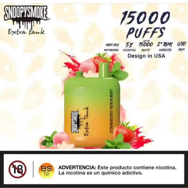 El vaporizador SnoopySmoke de 15.000 puffs es un dispositivo desechable que ofrece una experiencia de vapeo prolongada y satisfactoria. A continuación, te presento algunas características y beneficios clave: - Capacidad y rendimiento: - Hasta 15.000 puffs por dispositivo, lo que garantiza una experiencia prolongada y sin interrupciones - Contiene una cantidad considerable de e-líquido con una variedad de sabores y niveles de nicotina - Diseño y batería: - Batería integrada de alta capacidad para soportar la larga duración del dispositivo - Diseño ergonómico y portátil para facilitar su uso en cualquier momento - Ventajas: - Larga duración y gran cantidad de puffs por dispositivo - No requiere recarga, lo que lo hace ideal para uso en movimiento - Amplia variedad de sabores y opciones para elegir - Colaboración: - La marca SnoopySmoke sugiere una posible colaboración con el famoso rapero Snoop Dogg, lo que podría aportar experiencia y calidad al producto - Consideraciones: - Es importante seguir las instrucciones de uso y mantenimiento para garantizar la seguridad y longevidad del dispositivo En general, el vaporizador SnoopySmoke de 15.000 puffs parece ser una excelente opción para aquellos que buscan una experiencia de vapeo prolongada y satisfactoria.