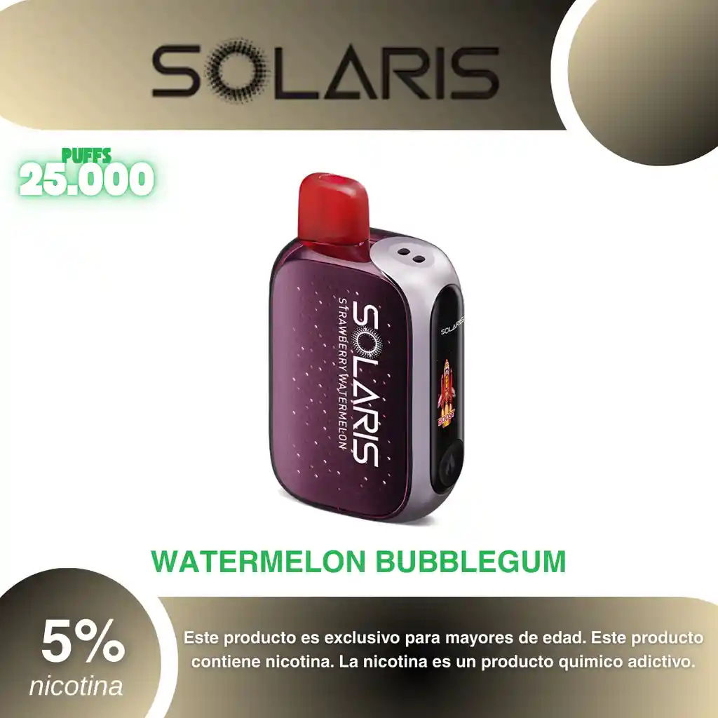 Vape Solaris 25.000 Pufs, Watermelon Bubblegum 5% PROHIBIDA LA VENTA A MENORES DE EDAD. ADVERTENCIA: ESTE PRODUCTO CONTIENE NICOTINA, LA NICOTINA ES UNA SUSTANCIA QUIMICA ADICTIVA Y NOCIVA PARA LA SALUD. Los líquidos para vapeo contienen: propilenglicol USP, glicerina USP, sabor artificial y nicotina. Este producto puede contener nicotina, una sustancia altamente adictiva que puede generar dependencia, posibles afectaciones arteriales, cardiacas, pulmonares y otras aun no identificadas. No se recomienda su uso a mujeres en embarazo, puede generar lesiones al feto. Mantener alejado de niños y mascotas. No ingerir, puede generar irritación y/o intoxicación. Por favor antes de consumir consulte a su médico posibles afectaciones o sensibilidad a alguno de sus componentes. Los componentes de este producto pueden aumentar la sensación de ansiedad En caso de notar alguna reacción adversa por favor suspenda su uso de manera inmediata. Siga las instrucciones en el envase. No alterar sus componentes. Adquiera sus productos en sitios de confianza No use productos piratas, alterados, o en los cuales no pueda comprobar su buena procedencia, Verifique la reputación del fabricante y distribuidor antes de adquirir cualquier producto Si no es usuario fumador o vapeador no se recomienda su uso bajo ninguna circunstancia Al usar este producto usted es consciente que este producto puede generar afectaciones a su salud, incluyendo aquellas que a la fecha de la compra no se han identificado y que pueden aparecer a largo plazo