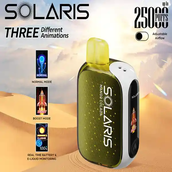 🥭☀️ Solaris – Mango Colada 🍍💨 Disfruta del sabor tropical y cremoso de Mango Colada, la mezcla perfecta de mango dulce y piña refrescante que te transporta directo a la playa con cada calada 🌴🍹 Con la tecnología de Solaris: ☀️ Carga solar integrada para que nunca te quedes sin batería, donde sea que estés ⚡ Modo BOOST para un golpe extra de vapor y sabor intenso 🔋 Batería potente y duradera, lista para acompañarte todo el día Simple, potente y con un sabor que enamora. Solaris Mango Colada es la manera inteligente y fresca de vapea sin complicaciones.