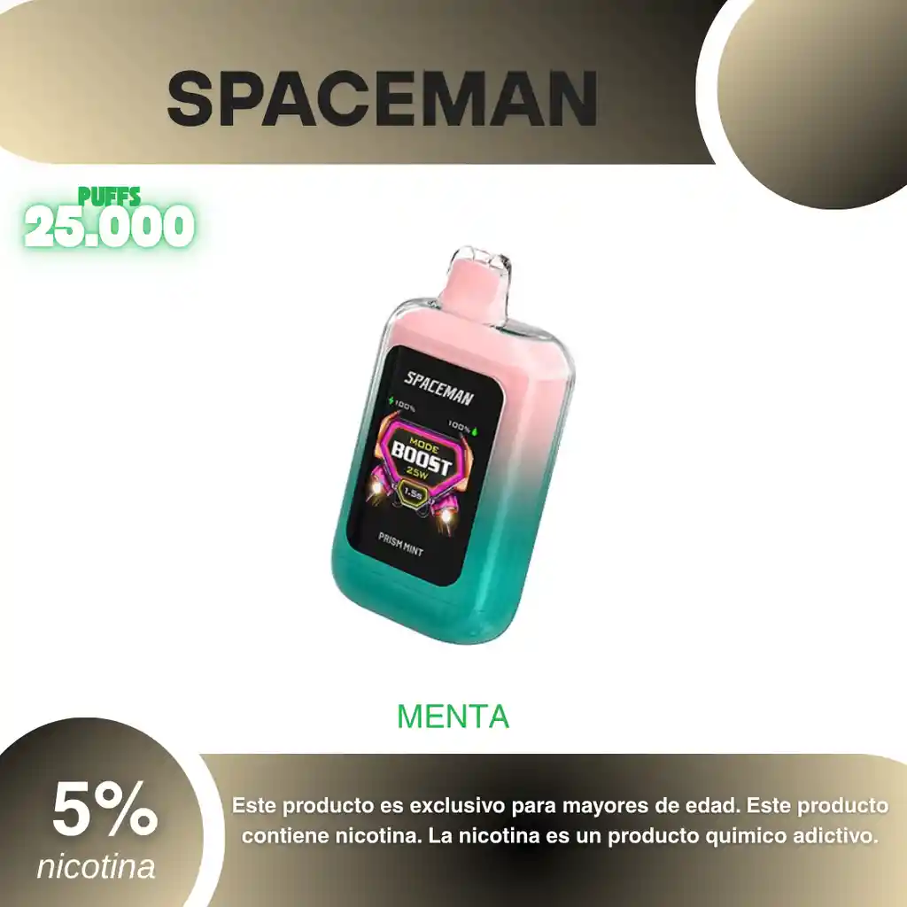 Spaceman 25.000 Puffs, Sabor Menta 5% PROHIBIDA LA VENTA A MENORES DE EDAD. ADVERTENCIA: ESTE PRODUCTO CONTIENE NICOTINA, LA NICOTINA ES UNA SUSTANCIA QUIMICA ADICTIVA Y NOCIVA PARA LA SALUD. Los líquidos para vapeo contienen: propilenglicol USP, glicerina USP, sabor artificial y nicotina. Este producto puede contener nicotina, una sustancia altamente adictiva que puede generar dependencia, posibles afectaciones arteriales, cardiacas, pulmonares y otras aun no identificadas. No se recomienda su uso a mujeres en embarazo, puede generar lesiones al feto. Mantener alejado de niños y mascotas. No ingerir, puede generar irritación y/o intoxicación. Por favor antes de consumir consulte a su médico posibles afectaciones o sensibilidad a alguno de sus componentes. Los componentes de este producto pueden aumentar la sensación de ansiedad En caso de notar alguna reacción adversa por favor suspenda su uso de manera inmediata. Siga las instrucciones en el envase. No alterar sus componentes. Adquiera sus productos en sitios de confianza No use productos piratas, alterados, o en los cuales no pueda comprobar su buena procedencia, Verifique la reputación del fabricante y distribuidor antes de adquirir cualquier producto Si no es usuario fumador o vapeador no se recomienda su uso bajo ninguna circunstancia Al usar este producto usted es consciente que este producto puede generar afectaciones a su salud, incluyendo aquellas que a la fecha de la compra no se han identificado y que pueden aparecer a largo plazo