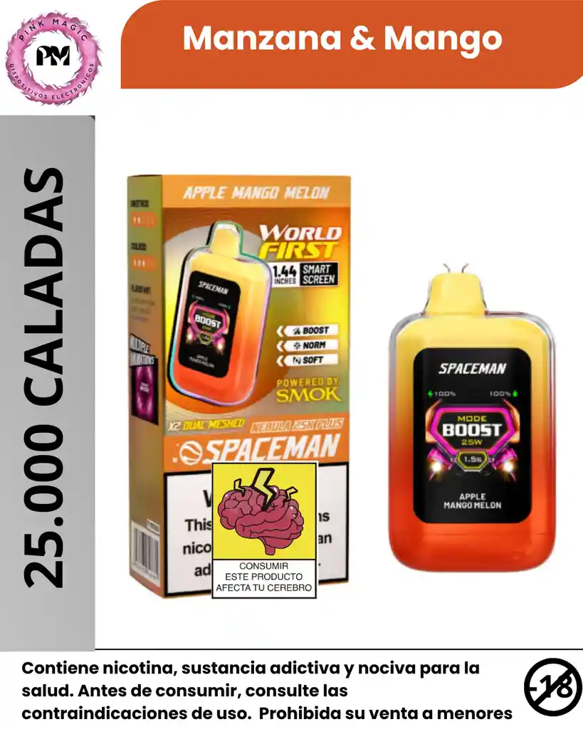 El Smok Spaceman Nebula 25K Plus en el sabor Apple Mango Melon es un vaporizador desechable de alta capacidad diseñado para ofrecer hasta 25,000 caladas. Este dispositivo combina una mezcla frutal de manzanas dulces, mangos jugosos y melones refrescantes