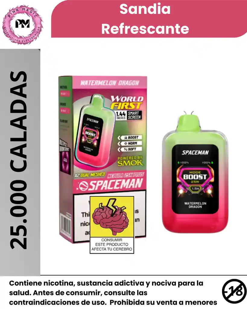 El SMOK Spaceman Nebula 25K Plus en el sabor Watermelon Dragon es un dispositivo de vapeo desechable de alta capacidad que combina los sabores de la sandía y la fruta del dragón