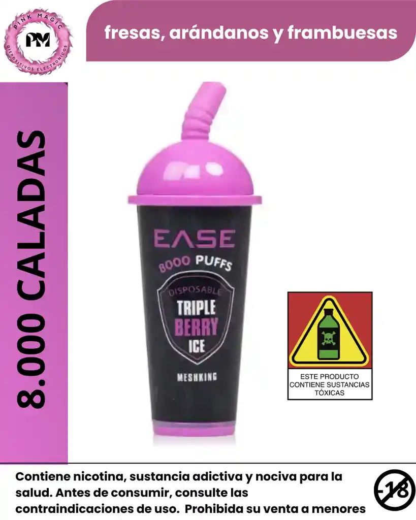 El sabor Triple Berry Ice es una mezcla popular que combina tres tipos de bayas (fresas, arándanos y frambuesas) con un toque refrescante de mentol o "hielo". Actualmente, una de las opciones más destacadas bajo el nombre Ease es el dispositivo desechable de 8,000 caladas