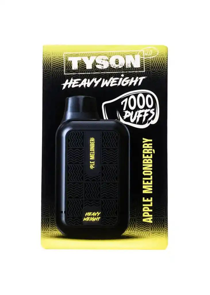Tyson Heavyweight 7.000 Puffs, Sabor Manzana Melon Berry 5% PROHIBIDA LA VENTA A MENORES DE EDAD. ADVERTENCIA: ESTE PRODUCTO CONTIENE NICOTINA, LA NICOTINA ES UNA SUSTANCIA QUIMICA ADICTIVA Y NOCIVA PARA LA SALUD. Los líquidos para vapeo contienen: propilenglicol USP, glicerina USP, sabor artificial y nicotina. Este producto puede contener nicotina, una sustancia altamente adictiva que puede generar dependencia, posibles afectaciones arteriales, cardiacas, pulmonares y otras aun no identificadas. No se recomienda su uso a mujeres en embarazo, puede generar lesiones al feto. Mantener alejado de niños y mascotas. No ingerir, puede generar irritación y/o intoxicación. Por favor antes de consumir consulte a su médico posibles afectaciones o sensibilidad a alguno de sus componentes. Los componentes de este producto pueden aumentar la sensación de ansiedad En caso de notar alguna reacción adversa por favor suspenda su uso de manera inmediata. Siga las instrucciones en el envase. No alterar sus componentes. Adquiera sus productos en sitios de confianza No use productos piratas, alterados, o en los cuales no pueda comprobar su buena procedencia, Verifique la reputación del fabricante y distribuidor antes de adquirir cualquier producto Si no es usuario fumador o vapeador no se recomienda su uso bajo ninguna circunstancia Al usar este producto usted es consciente que este producto puede generar afectaciones a su salud, incluyendo aquellas que a la fecha de la compra no se han identificado y que pueden aparecer a largo plazo