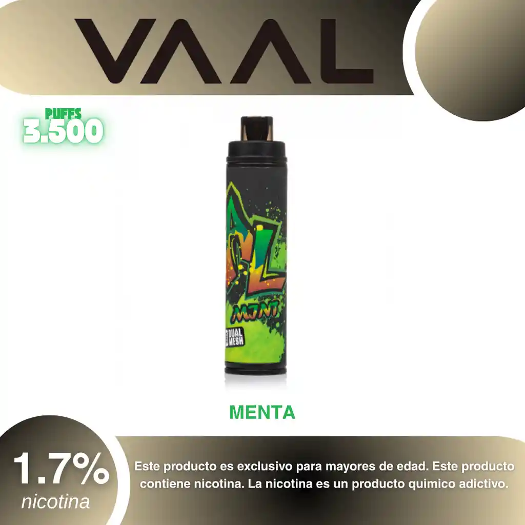 VAAL MAX 3.500 PUFFS 1.7% SABOR A MENTA PROHIBIDA LA VENTA A MENORES DE EDAD. ADVERTENCIA: ESTE PRODUCTO CONTIENE NICOTINA, LA NICOTINA ES UNA SUSTANCIA QUIMICA ADICTIVA Y NOCIVA PARA LA SALUD. Los líquidos para vapeo contienen: propilenglicol USP, glicerina USP, sabor artificial y nicotina. Este producto puede contener nicotina, una sustancia altamente adictiva que puede generar dependencia, posibles afectaciones arteriales, cardiacas, pulmonares y otras aun no identificadas. No se recomienda su uso a mujeres en embarazo, puede generar lesiones al feto. Mantener alejado de niños y mascotas. No ingerir, puede generar irritación y/o intoxicación. Por favor antes de consumir consulte a su médico posibles afectaciones o sensibilidad a alguno de sus componentes. Los componentes de este producto pueden aumentar la sensación de ansiedad En caso de notar alguna reacción adversa por favor suspenda su uso de manera inmediata. Siga las instrucciones en el envase. No alterar sus componentes. Adquiera sus productos en sitios de confianza No use productos piratas, alterados, o en los cuales no pueda comprobar su buena procedencia, Verifique la reputación del fabricante y distribuidor antes de adquirir cualquier producto Si no es usuario fumador o vapeador no se recomienda su uso bajo ninguna circunstancia Al usar este producto usted es consciente que este producto puede generar afectaciones a su salud, incluyendo aquellas que a la fecha de la compra no se han identificado y que pueden aparecer a largo plazo