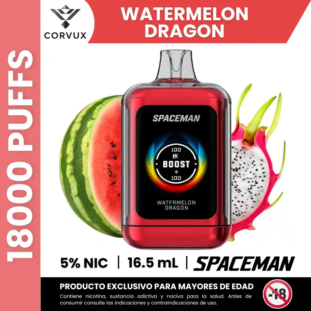 PROHIBIDA LA VENTA A MENORES DE EDAD. PRODUCTO EXCLUSIVO PARA MAYORES DE EDAD, CONTIENE NICOTINA, SUSTANCIA ADICTIVA Y NOCIVA PARA LA SALUD. ANTES DE CONSUMIR, CONSULTE LAS INDICACIONES Y CONTRAINDICACIONES DE USO. Spaceman 18000 Puffs – Watermelon Dragon | Sandía Pitaya Dispositivo desechable con perfil frutal tropical que mezcla sandía refrescante con fruta del dragón, creando un sabor dulce y exótico claramente orientado a lo artificial tipo vape. ✨ Perfil de Sabor ✦ Notas principales: Sandía jugosa como base dominante acompañada de fruta del dragón con matiz suave, ligeramente floral y tropical. ✦ Contrastes: Dulzura fresca de sandía combinada con un toque exótico más sutil del dragon fruit, generando un perfil equilibrado sin acidez agresiva. ✦ Experiencia sensorial: Sabor dulce, tropical y refrescante donde la sandía lleva el protagonismo mientras la fruta del dragón aporta complejidad sin dominar. ✦ Ideal para: Usuarios que buscan un perfil frutal más suave y tropical, sin acidez tipo candy, y que prefieren sabores más redondos y fáciles de usar todo el día. 📋 Especificaciones Técnicas: ✦ Hasta 18.000 puffs ✦ E-liquid aprox. 16.5 ml ✦ Nicotina: 5% (50 mg) ✦ Batería aprox. 1000 mAh ✦ Activación automática por inhalación ✦ Pantalla LED PROHIBIDA LA VENTA A MENORES DE EDAD. PRODUCTO EXCLUSIVO PARA MAYORES DE EDAD, CONTIENE NICOTINA, SUSTANCIA ADICTIVA Y NOCIVA PARA LA SALUD. ANTES DE CONSUMIR, CONSULTE LAS INDICACIONES Y CONTRAINDICACIONES DE USO.