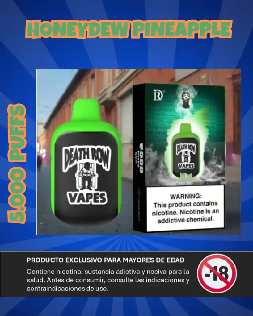 DESCRIPCIÓN DEL PRODUCTO Death Row Vapes 10.5ML 5000 Puffs 500mAh Dispositivo de vape desechable recargable de sal de nicotina precargada ¡Presentamos la última colaboración entre Death Row Vapes - Snoop Dogg - Harry-O, el vaporizador compacto con unas increíbles 5000 bocanadas! Experimente la máxima comodidad de un dispositivo recargable que cabe fácilmente en su bolsillo o bolso, brindando una explosión de sabor con cada bocanada. Características : Sal de nicotina: 5% Capacidad de líquido electrónico precargado: 10,5 ML Batería integrada de 500 mAh Gran capacidad con 5000 bocanadas Puerto de carga: Tipo-C Sabores : Apple Watermelon | Black Ice | Blue Razz | Clear | Honeydew Pineapple | Ice Cola | Kiwi Strawberry | Lush Ice | Mango Grape | Mango Peach Watermelon | Mint | Peach Grape | Rainbow Pop | Strawberry Banana | Strawberry Melon | Strawberry Peach | Strawberry Slush | Tangerine Bomb | Tobacco | Wild Berries | Blueberry Mint | Candy Incluido : 1 x Death Row Vapes 10.5ML 5000 Puffs 500mAh Dispositivo de vape desechable recargable de sal de nicotina precargada