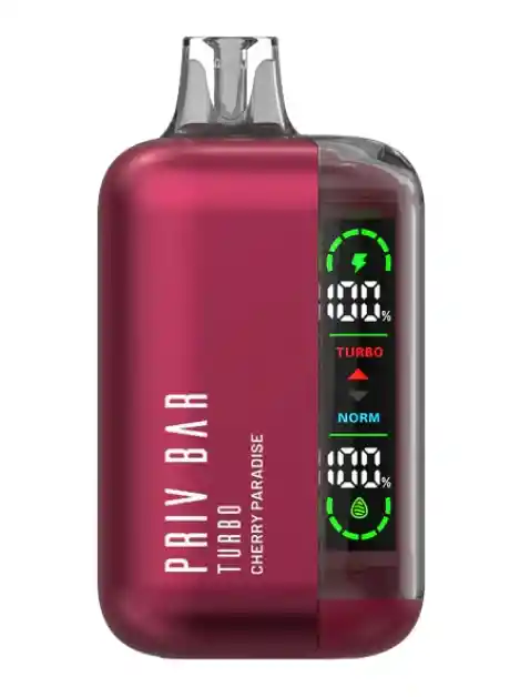 PRIV BAR TURBO VAPE Sabor: Saborea la dulzura afrutada de Cherry Paradise Priv Bar Turbo. Este sabor es una mezcla armoniosa de notas ácidas y de cereza dulce. Contenido del e-líquido: 16ml Nivel de nicotina: 50 mg Bocanadas por dispositivo: 10000 (modo turbo)/15000 Batería: 800 mAh (recargable a través de USB-C) Modo Turbo: Mayor potencia para un mayor sabor y soplo Pantalla LED: Indicadores de batería, e-juice y modo de energía Flujo de aire ajustable