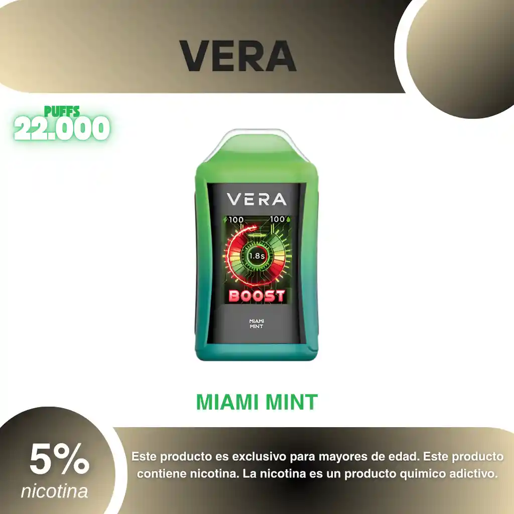 Vape Vera Vr 22.000 Puffs Sabor Menta 5% PROHIBIDA LA VENTA A MENORES DE EDAD. ADVERTENCIA: ESTE PRODUCTO CONTIENE NICOTINA, LA NICOTINA ES UNA SUSTANCIA QUIMICA ADICTIVA Y NOCIVA PARA LA SALUD. Los líquidos para vapeo contienen: propilenglicol USP, glicerina USP, sabor artificial y nicotina. Este producto puede contener nicotina, una sustancia altamente adictiva que puede generar dependencia, posibles afectaciones arteriales, cardiacas, pulmonares y otras aun no identificadas. No se recomienda su uso a mujeres en embarazo, puede generar lesiones al feto. Mantener alejado de niños y mascotas. No ingerir, puede generar irritación y/o intoxicación. Por favor antes de consumir consulte a su médico posibles afectaciones o sensibilidad a alguno de sus componentes. Los componentes de este producto pueden aumentar la sensación de ansiedad En caso de notar alguna reacción adversa por favor suspenda su uso de manera inmediata. Siga las instrucciones en el envase. No alterar sus componentes. Adquiera sus productos en sitios de confianza No use productos piratas, alterados, o en los cuales no pueda comprobar su buena procedencia, Verifique la reputación del fabricante y distribuidor antes de adquirir cualquier producto Si no es usuario fumador o vapeador no se recomienda su uso bajo ninguna circunstancia Al usar este producto usted es consciente que este producto puede generar afectaciones a su salud, incluyendo aquellas que a la fecha de la compra no se han identificado y que pueden aparecer a largo plazo