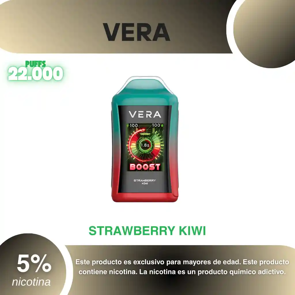 Vape Vera Vr 22.000 Puffs, Sabor Fresa Kiwi 5% PROHIBIDA LA VENTA A MENORES DE EDAD. ADVERTENCIA: ESTE PRODUCTO CONTIENE NICOTINA, LA NICOTINA ES UNA SUSTANCIA QUIMICA ADICTIVA Y NOCIVA PARA LA SALUD. Los líquidos para vapeo contienen: propilenglicol USP, glicerina USP, sabor artificial y nicotina. Este producto puede contener nicotina, una sustancia altamente adictiva que puede generar dependencia, posibles afectaciones arteriales, cardiacas, pulmonares y otras aun no identificadas. No se recomienda su uso a mujeres en embarazo, puede generar lesiones al feto. Mantener alejado de niños y mascotas. No ingerir, puede generar irritación y/o intoxicación. Por favor antes de consumir consulte a su médico posibles afectaciones o sensibilidad a alguno de sus componentes. Los componentes de este producto pueden aumentar la sensación de ansiedad En caso de notar alguna reacción adversa por favor suspenda su uso de manera inmediata. Siga las instrucciones en el envase. No alterar sus componentes. Adquiera sus productos en sitios de confianza No use productos piratas, alterados, o en los cuales no pueda comprobar su buena procedencia, Verifique la reputación del fabricante y distribuidor antes de adquirir cualquier producto Si no es usuario fumador o vapeador no se recomienda su uso bajo ninguna circunstancia Al usar este producto usted es consciente que este producto puede generar afectaciones a su salud, incluyendo aquellas que a la fecha de la compra no se han identificado y que pueden aparecer a largo plazo