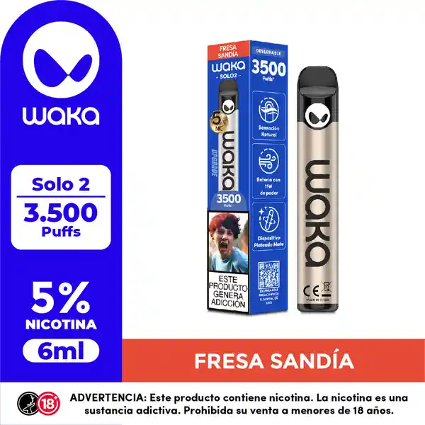 WAKA SOLO 2: Vapeador desechable sabor fresa y sandía. Contiene 5% de nicotina. Capacidad de e-líquido: 6 ml; ...Ver más