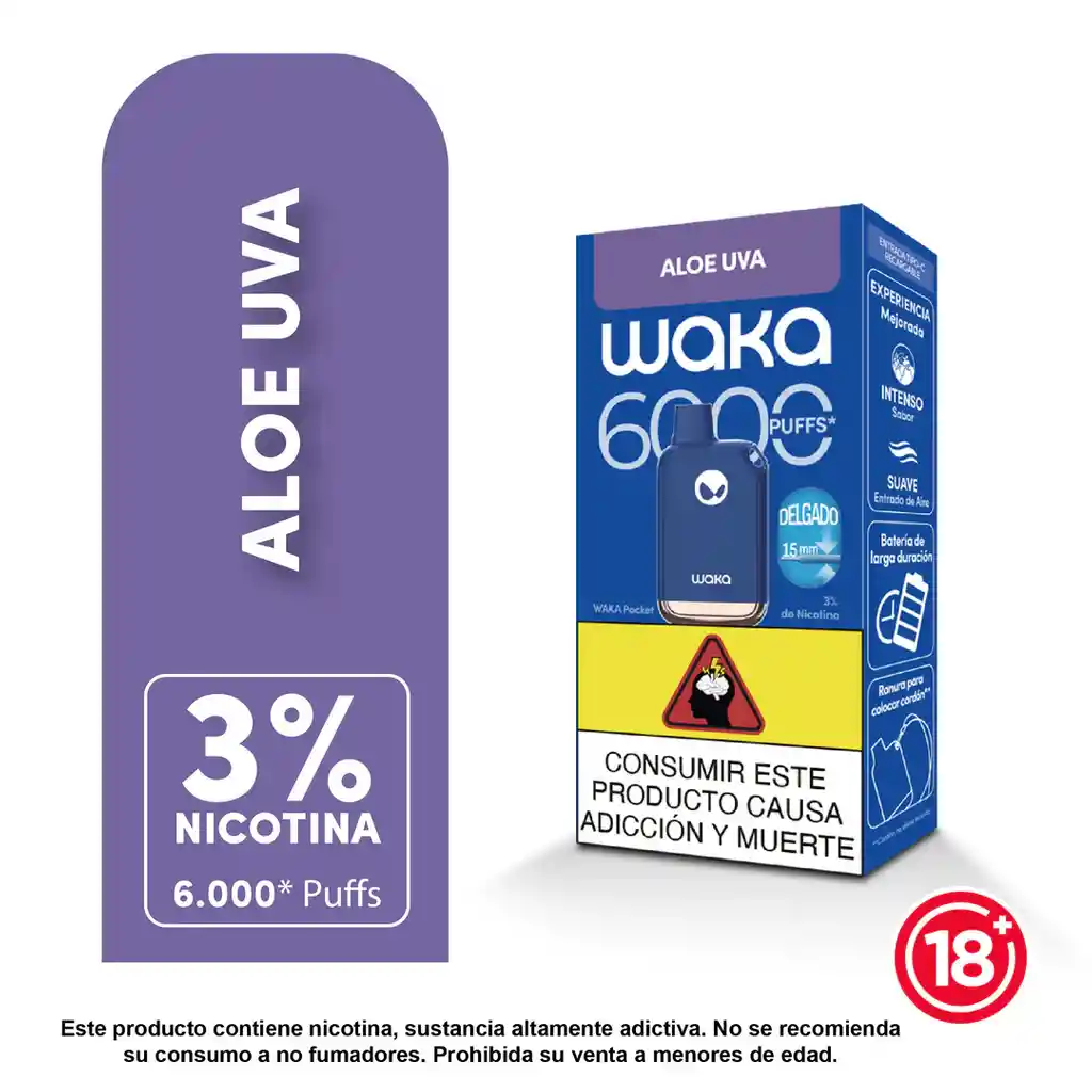 Vapeador Desechable marca Waka sabor a Uva Aloe. Fuerza de nicotina: 3%. Sal de nicotina equivalente a aproximadamente 1 paquete de cigarrillos. Capacidad de la batería: 500 mAh. Número de bocanadas: hasta 6000 Puffs o caladas. Prohibida la venta a menores de edad. Producto nocivo para la salud que contiene nicotina, sustancia altamente adictiva. Antes de consumir consulte las indicaciones y contraindicaciones de uso.