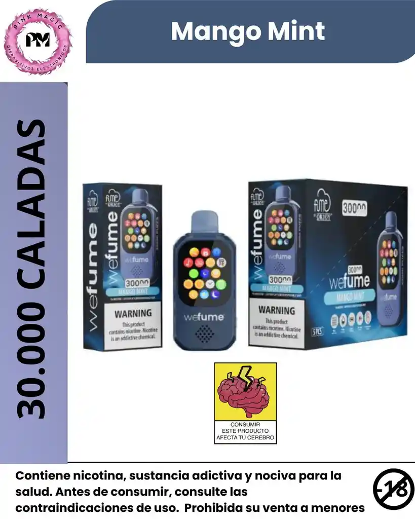 WeFume es una mezcla frutal que combina la dulzura intensa de los arándanos maduros con la cremosidad suave del banano. Este sabor está disponible principalmente en el modelo WeFume 30,000 Puffs, un dispositivo inteligente que destaca por las siguientes características: Perfil de Sabor: Una combinación equilibrada de notas de bayas dulces y una base cremosa de banano. Algunos usuarios describen los sabores de esta marca como consistentes desde la primera hasta la última calada. Capacidad y Rendimiento: Ofrece hasta 30,000 caladas (puffs) gracias a sus 19 ml de e-liquid prellenado. Tecnología "Smart": Es un vapeador avanzado que incluye: Conectividad Bluetooth: Se sincroniza con el smartphone para recibir llamadas y controlar música. Pantalla Táctil: Permite interactuar con hasta 16 aplicaciones integradas, incluyendo juegos y funciones de voz. Funciones Extra: Cuenta con herramientas útiles como reloj, alarma y linterna incorporada.