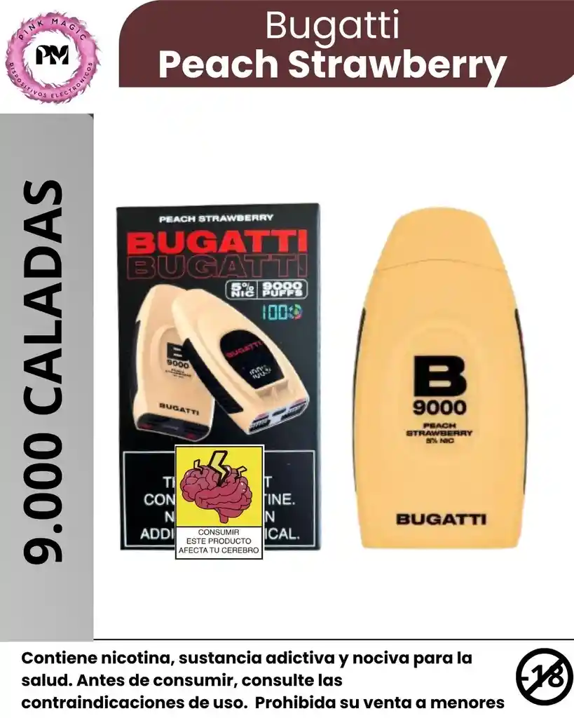 Bugatti Vape 9K – Diseño premium y alto rendimiento 🚗💨 El Bugatti Vape 9K es un vape desechable diseñado para quienes buscan estilo, potencia y duración en un solo dispositivo. Con hasta 9.000 caladas, ofrece un rendimiento confiable y una experiencia de vapeo suave y consistente. Su diseño elegante y moderno refleja la esencia premium de la marca Bugatti, ideal para quienes valoran la estética sin sacrificar calidad. Los sabores están formulados para mantenerse intensos desde la primera hasta la última calada. ⭐ Características destacadas: Hasta 9.000 puffs por dispositivo. Sabores intensos y duraderos. Diseño premium, moderno y compacto. Fácil de usar: listo para usar, sin recargas ni configuraciones. Ideal para el uso diario.