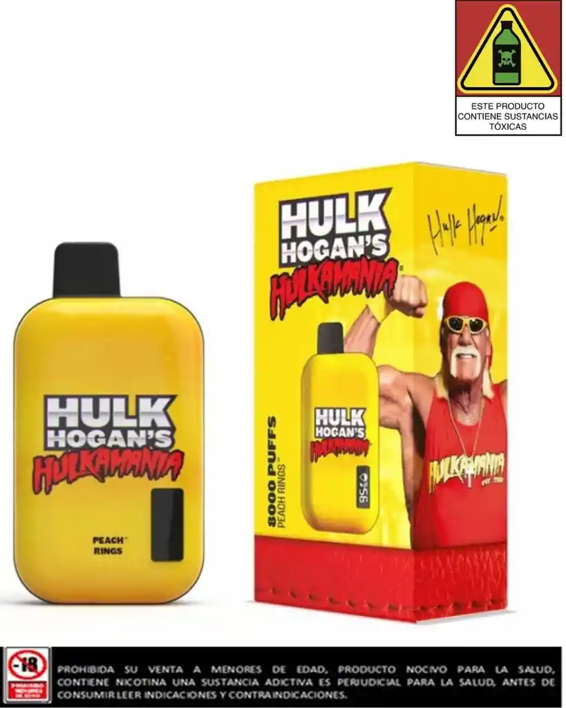 El vapeador desechable Hulk Hogan 8000 Puffs está diseñado para ofrecer una experiencia de vapeo prolongada, con un dispositivo compacto y fácil de usar. Existen dos versiones que rinden homenaje a la carrera de la estrella de la lucha libre: la edición Hulkamania, con sabores más clásicos, y la edición Hollywood, que ofrece una experiencia más suave. Características principales Capacidad: Viene precargado con 18 ml de líquido con sales de nicotina, lo que permite hasta 8000 caladas aproximadamente. Fuerza de la nicotina: La concentración es del 5% (50 mg) de sales de nicotina. Batería: Cuenta con una batería recargable de 550mAh, que se carga a través de un puerto USB-C. Pantalla inteligente: Un indicador digital muestra el nivel de batería y la cantidad de e-líquido restante, para que sepas cuándo es necesario recargar o desechar el dispositivo. Resistencia: Incorpora una resistencia de malla (mesh coil) para optimizar la producción de vapor y mejorar el sabor. Mecanismo de activación: Se activa automáticamente con la inhalación, sin necesidad de presionar ningún botón. Versiones y sabores El dispositivo está disponible en dos estilos principales, cada uno con una variedad de sabores: Hulkamania: Representa la etapa más enérgica de Hulk Hogan en el ring, con sabores más intensos y vibrantes. Hollywood Hulk: Inspirado en su fase más "cool" y villana, con sabores más suaves y complejos.