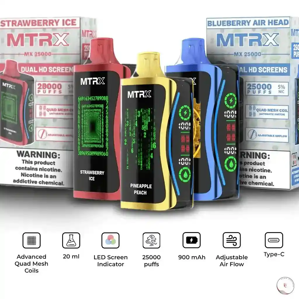 Características principales E-líquido precargado de 20 ml Concentración de nicotina del 5 % (50 mg) Batería recargable tipo C de 900 mAh Aproximadamente 25.000 bocanadas Bobina de malla cuádruple Cambia automáticamente las bobinas duales cada 10 segundos Pantalla dual HD 3 animaciones únicas de vapeo La pantalla del panel lateral muestra el porcentaje de batería y e-líquido Flujo de aire ajustable