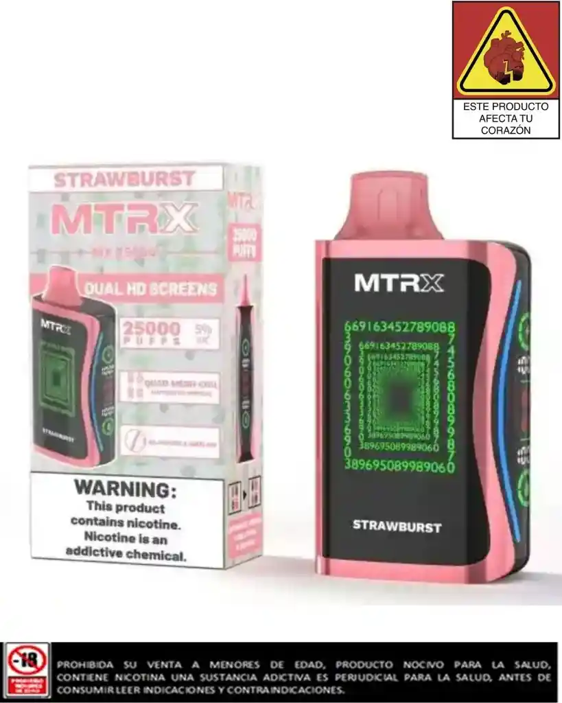 25,000 razones para no bajarle el ritmo" Tu nuevo MTRX MX25000 lo tiene todo: doble pantalla HD, carga rápida USB-C, 20 ml de líquido, coil cuádruple que cambia automáticamente… todo para que cada calada sea pura potencia, sin interrupciones. Prohibida su venta a menores de edad, contiene nicotina una sustancia adictiva, perjudicial para la salud, antes de usar leer las indicaciones y contraindicaciones