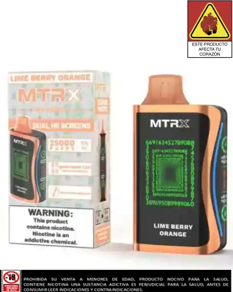 25,000 razones para no bajarle el ritmo" Tu nuevo MTRX MX25000 lo tiene todo: doble pantalla HD, carga rápida USB-C, 20 ml de líquido, coil cuádruple que cambia automáticamente… todo para que cada calada sea pura potencia, sin interrupciones. Prohibida su venta a menores de edad, contiene nicotina una sustancia adictiva, perjudicial para la salud, antes de usar leer las indicaciones y contraindicaciones