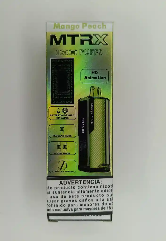 El MTRX es un vapo recargable de última tecnología, diseñado para ofrecer hasta 12,000 inhalaciones con una carga. Con un nivel de nicotina del 5%, su potente batería y sistema de interfaz digital, brinda una experiencia de vapeo óptima. CARACTERÍSTICAS: - Hasta 12,000 puffs por dispositivo. - Concentración de nicotina al 5%. - Interfaz digital con indicador de nivel de líquido, batería y animación de vapeo. - Tapa y cuerpo duraderos con recarga mediante puerto USB-C. - Modos de vapeo: Regular y Boost. ESPECIFICACIONES: - Capacidad de puffs: 12,000 inhalaciones. - Nivel de nicotina: 5%. - Carga: USB-C. - Modos: Regular y Boost. Mango peach una mezcla frutal refrescante que combina la dulzura del durazno con el toque exótico del mango, ideal para quienes prefieren sabores suaves y vibrantes.