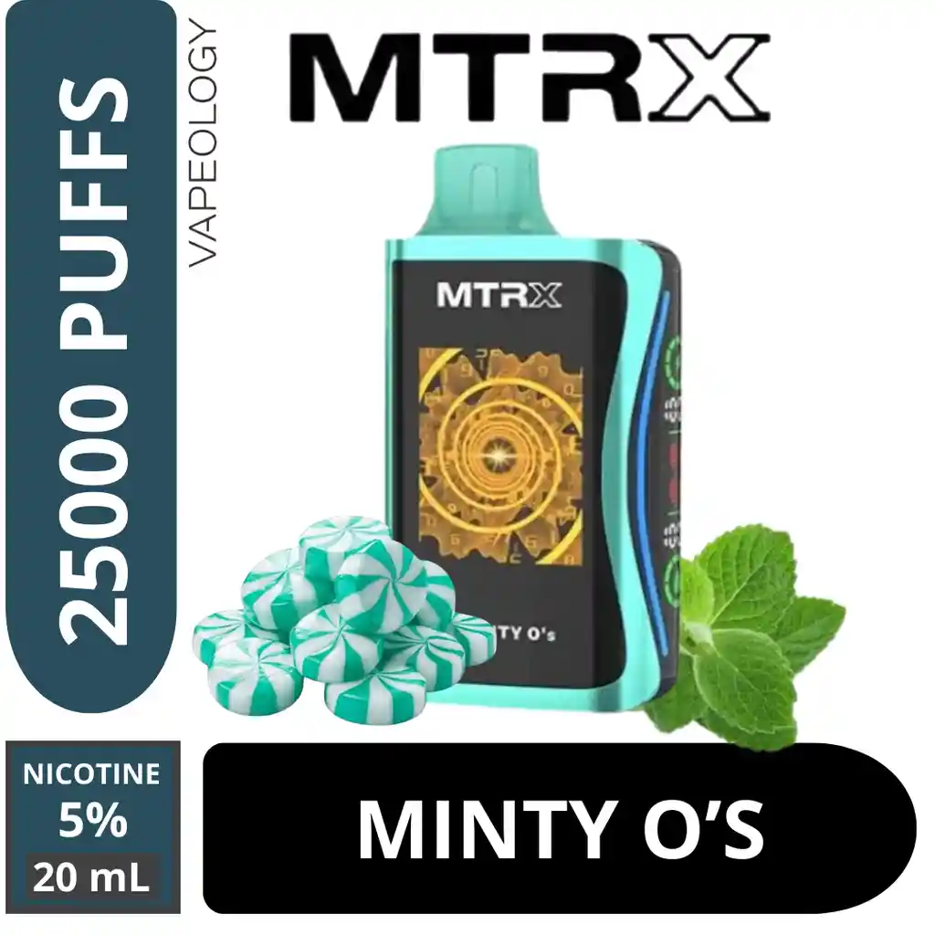 MTRX Vape MX25000 Menta Helada. • E-líquido precargado de 20 ml • 5 % (50 mg) de concentración de nicotina • Batería recargable tipo C de 900 mAh • Aproximadamente 25 000 bocanadas • Bobina de malla cuádruple • Cambia automáticamente las bobinas dobles cada 10 segundos • Pantalla HD dual • 3 animaciones de vapeo únicas.
