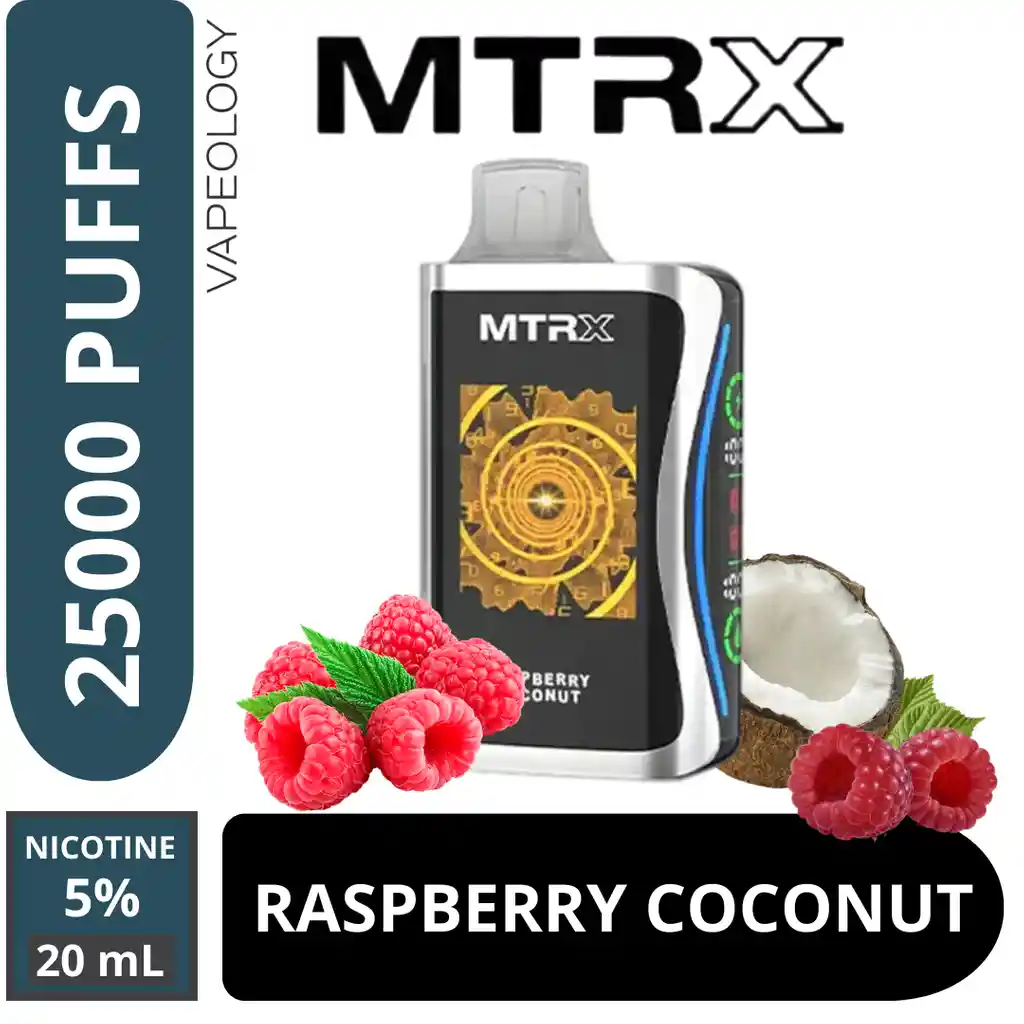 MTRX Vape MX25000 Frambuesa Coco. • E-líquido precargado de 20 ml • 5 % (50 mg) de concentración de nicotina • Batería recargable tipo C de 900 mAh • Aproximadamente 25 000 bocanadas • Bobina de malla cuádruple • Cambia automáticamente las bobinas dobles cada 10 segundos • Pantalla HD dual • 3 animaciones de vapeo únicas.