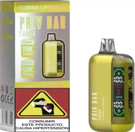 Experimenta con el vaporizador desechable PRIV BAR de 15.000 puffs. Limonada brillante y ácida de los soleados bosques de Florida. Pantalla completa con indicador de potencia, nivel de batería de 800 mAh, capacidad de E-liquido de flujo de aire ajustable en 3 niveles. Batería recargable Tipo-C. 15,000 caladas en modo normal y 10,000 caladas en modo TURBO, con 5% de nicotina.