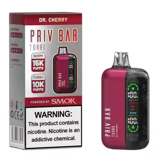Sabor: Dr. Cherry Contenido de esencia: 16 ml Puffs: 15000 Recargable: Sí, Tipo C. 18+ producto exclusivo para mayores de edad. Contiene 5% de nicotina, sustancia adictiva. Batería 800 mAh. Posee modo turbo para más sabor y poder del puff. Con pantalla Led, la cual muestra el porcentaje de batería, modo y porcentaje de esencia. Con flujo de aire ajustable.