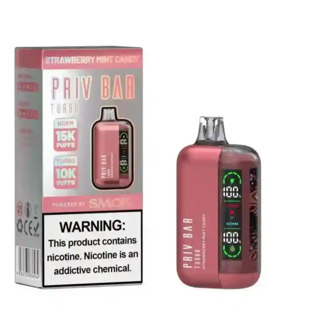 Priv Bar Turbo 15000 y 16 ml de de líquido precargado y una batería recargable , disfruta 15000 puff, pantalla de visualización te muestra el estado de la batería y el nivel del líquido.