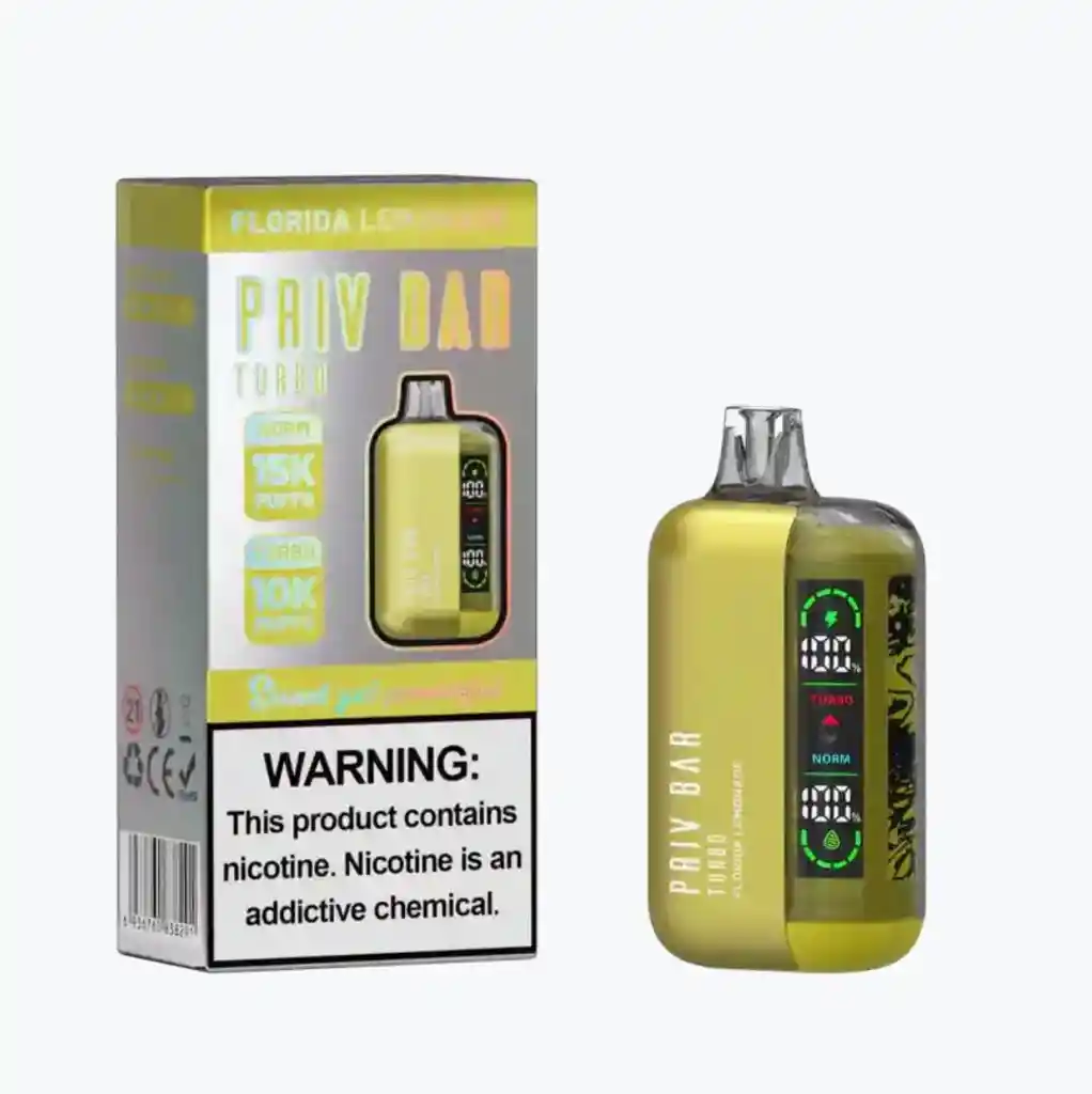 Priv Bar Turbo 15000 y 16 ml de de líquido precargado y una batería recargable , disfruta 15000 puff, pantalla de visualización te muestra el estado de la batería y el nivel del líquido.