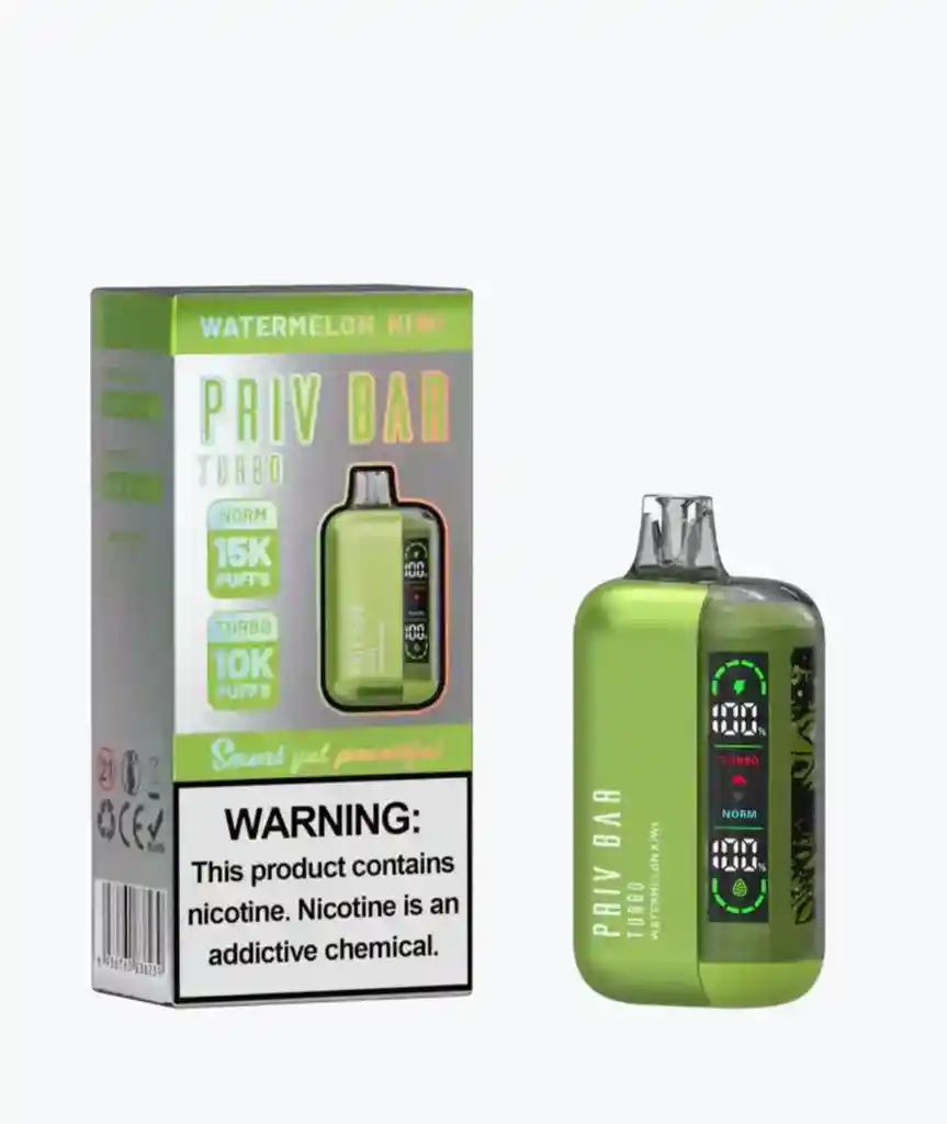 Priv Bar Turbo 15000 y 16 ml de de líquido precargado y una batería recargable , disfruta 15000 puff, pantalla de visualización te muestra el estado de la batería y el nivel del líquido.