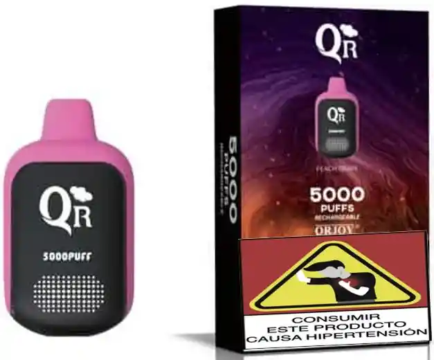 Vapeador QR 5000, desechable, fusión de sabores combinados de melocotón y uvas. Con 14 ml de e-líquido, un 5 % de nicotina, proporcionando la dosis perfecta. Batería recargable de 650 mAh y un puerto USB-C. Combina comodidad, rendimiento y durabilidad.
