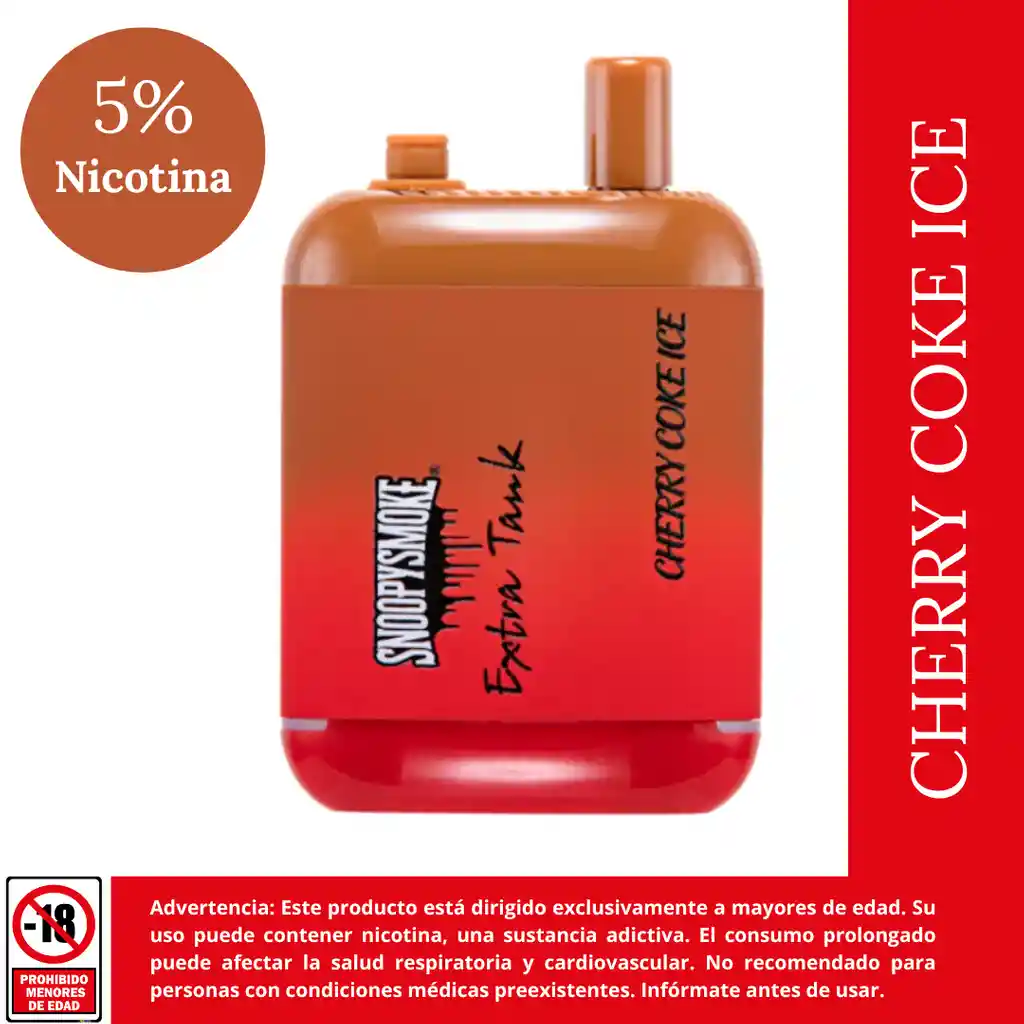 ¡Doble tanque, doble duración! El Snoopy Smoke Extra Tank revoluciona tu experiencia con un innovador sistema de dos tanques de e-liquid independientes que garantizan hasta 15,000 puffs de sabor intenso y constante. ste modelo combina la dulzura clásica de la cereza con el toque refrescante de la bebida de cola y un final de mentol (Ice) que te dejará una sensación de frescura inigualable. Su diseño ergonómico y recargable lo convierte en el compañero ideal para quienes buscan calidad y rendimiento prolongado. Sabor: Cherry Coke Ice (Cereza, Cola y Hielo). Capacidad: 15,000 inhalaciones aprox. Tecnología: Doble tanque para mayor frescura del líquido. Batería: Recargable mediante USB-C (cable no incluido). Uso: Activación automática por inhalación.