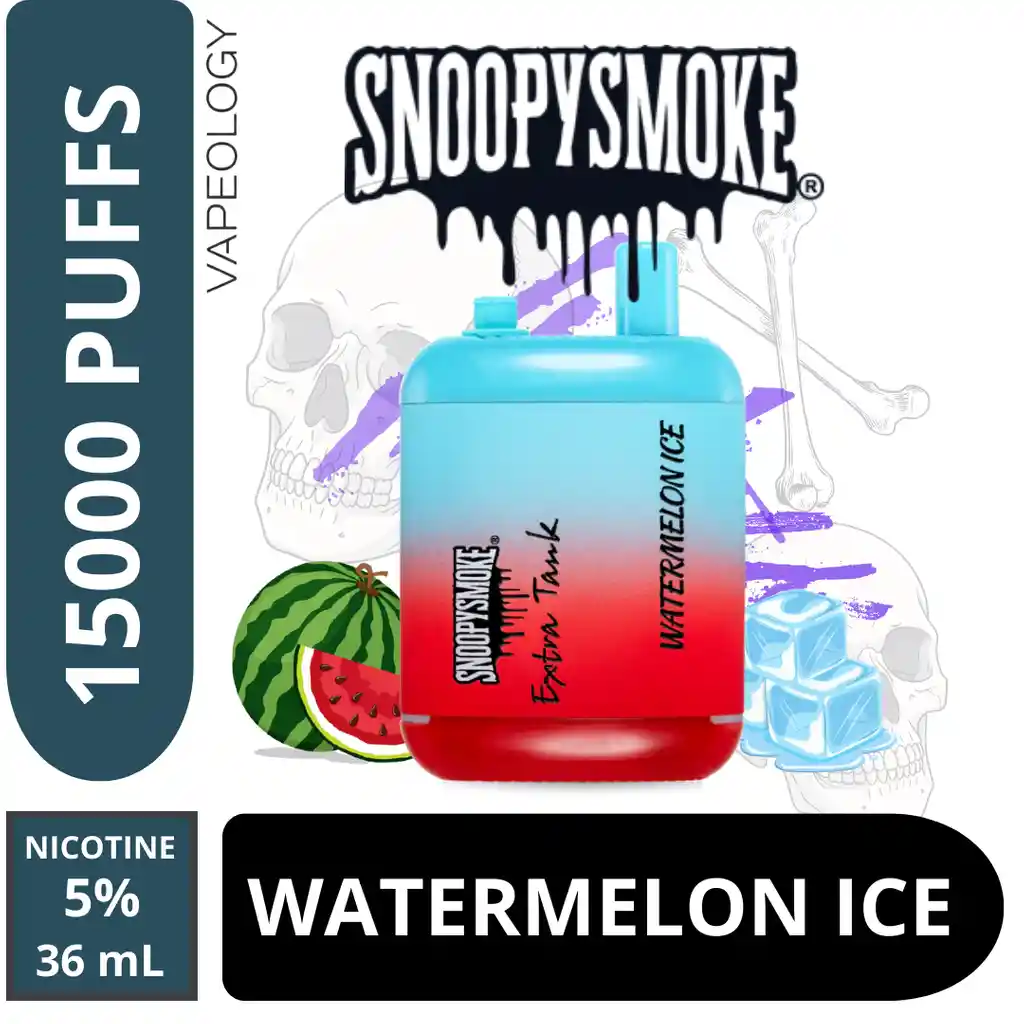 Snoopy Smoke Watermelon Ice – 15.000 bocanadas Explosión de sandía jugosa con mentol helado en cada calada. Este vape desechable ofrece un sabor dulce, frío y ultra refrescante que te limpia el paladar desde la primera inhalación. Con su doble tanque de 36 ml y batería recargable, te garantiza miles de bocanadas intensas, suaves y llenas de vapor. Diseño compacto, elegante y perfecto para el día a día. Más frescura, más sabor y máxima duración en un solo dispositivo.