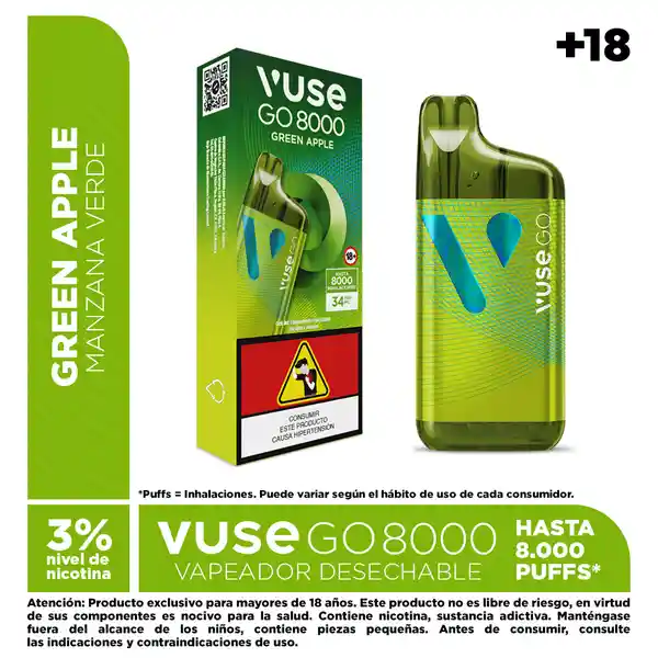 Atención: Producto exclusivo para mayores de 18 años Este producto no es libre de riesgo, en virtud de sus componentes es nocivo para la salud. Contiene nicotina, sustancia adictiva. Manténgase fuera del alcance de los niños, contiene piezas pequeñas. Antes de consumir, consulte las indicaciones y contraindicaciones de uso. Desde el 21 de julio de 2025 productores e importadores estarán obligados a comercializar sus productos con los pictogramas y advertencias sanitarias establecidas por el Ministerio de Salud. Por lo anterior, coexistirán en los puntos de venta y/o entregas a domicilio empaques de producto con o sin advertencia sanitaria, hasta que estos últimos sean comercializados en su totalidad. La presente comunicación se publica en cumplimiento de lo dispuesto en los artículos 3 (numeral 1.3) y 23 a 28 del Estatuto del Consumidor (Ley 1480 de 2011), suministra información clara, suficiente, veraz y oportuna. El contenido aquí publicado no tiene fines promocionales ni publicitarios.Ingredientes: propilenglicol, glicerina vegetal, saborizante artificial de manzana, nicotina (producto adictivo y nocivo para la salud), ácido benzoico, ácido láctico, agua, alcohol bencílico, hexanal y hexenal (2-). Empaque con 1 dispositivo de Vuse GO 8000. Cont. Net. de líquido vaporizable: 15 ml. Contenido de nicotina: 510 mg. Intensidad total de nicotina (administración de dosis): 34 mg/ml, equivalente al 3% del contenido neto del dispositivo.