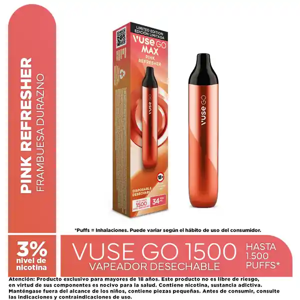 Atención: Producto exclusivo para mayores de 18 años Este producto no es libre de riesgo, en virtud de sus componentes es nocivo para la salud. Contiene nicotina, sustancia adictiva. Manténgase fuera del alcance de los niños, contiene piezas pequeñas. Antes de consumir, consulte las indicaciones y contraindicaciones de uso. Desde el 21 de julio de 2025 productores e importadores estarán obligados a comercializar sus productos con los pictogramas y advertencias sanitarias establecidas por el Ministerio de Salud. Por lo anterior, coexistirán en los puntos de venta y/o entregas a domicilio empaques de producto con o sin advertencia sanitaria, hasta que estos últimos sean comercializados en su totalidad. La presente comunicación se publica en cumplimiento de lo dispuesto en los artículos 3 (numeral 1.3) y 23 a 28 del Estatuto del Consumidor (Ley 1480 de 2011), suministra información clara, suficiente, veraz y oportuna. El contenido aquí publicado no tiene fines promocionales ni publicitarios.Ingredientes: glicerina vegetal, propilenglicol, saborizante artificial de kombucha frutada, nicotina, ácido benzoico, ácido láctico, agua, alcohol bencílico y furaneol. Empaque con 1 dispositivo de Vuse GO MAX. Cont. Net. de líquido vaporizable: 4.8 ml. Contenido de nicotina: 163.2 mg. Intensidad total de nicotina (administración de dosis): 34 mg/ml, equivalente al 3% del contenido neto del dispositivo.