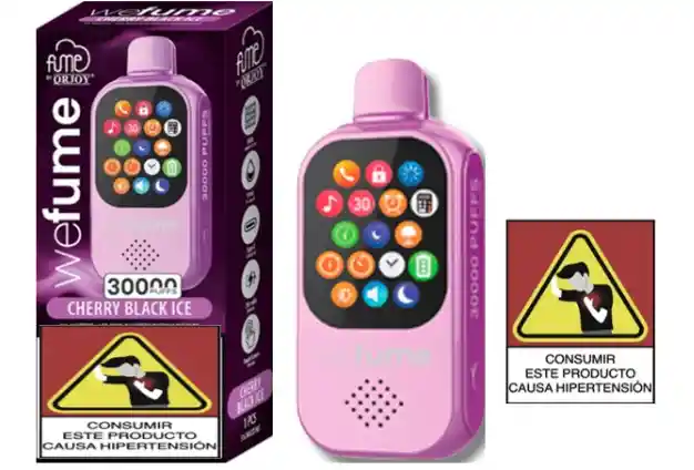 Wefume 30k Cherry Black Ice WeFume representa la máxima innovación en vapeo, diseñado para el usuario cotidiano . El cartucho desechable Fume WeFume 30000 es un dispositivo inteligente que ofrece 30 000 caladas . El WeFume 30000 de Fume está diseñado para brindar una experiencia de vapeo superior y duradera. Miami Mint es un sabor para vapear que suele presentar una refrescante mezcla de menta con un toque tropical. Si bien la composición exacta puede variar, a menudo incluye sabores de menta frescos y vigorizantes combinados con notas de frutas tropicales como piña, coco o cítricos. Esta combinación busca brindar una experiencia de vapeo refrescante y exótica, que evoca una escapada tropical. Wefume está marcando un nuevo estándar en la industria de los vaporizadores desechables. Diseñado tanto para los amantes del sabor como para los que buscan grandes nubes de vapor, Wefume ofrece una experiencia de vapeo superior con una batería de larga duración, un alto número de caladas y sabores intensos y satisfactorios que te harán querer más. Presupuesto Número de caladas: 30000 Capacidad de e-líquido: 19 ml Concentración de nicotina: 5% Pantalla táctil inteligente Función de voz Capacidad de la batería: 750 mAh Carga: USB-C Activación por inhalación Contenido del kit 1 x Wefume 30K desechable El WeFume 30K ofrece hasta 30 000 caladas con una capacidad de e-líquido precargado de 19 ml y una concentración de nicotina del 5 %. Cuenta con conectividad Bluetooth, una pantalla táctil inteligente y control por voz para una experiencia de vapeo de alta tecnología. Disponible en sabores como Black Ice, Miami Mint, Peach Banana y Strawberry Kiwi. El Wefume Vape 30K ofrece una experiencia de vapeo inmersiva y de vanguardia con hasta 30 000 caladas. Este dispositivo recargable incluye una batería integrada de 750 mAh y 19 ml de e-líquido precargado con una concentración de nicotina del 5 % (50 mg). Su pantalla táctil con juegos integrados, reproducción de música e incluso funciones de voz añade entretenimiento a tu rutina de vapeo. Puedes contestar llamadas, configurar alarmas y disfrutar de la conectividad Bluetooth, todo desde tu vapeadvapeo MTL (boca a pulmón), se activa al inhalar y admite carga USB tipo C (cable no incluido), ofreciendo comodidad y una mayor autonomía.