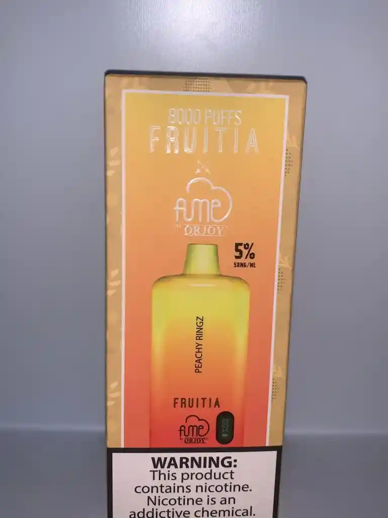 VAPE FRUITIA 8000 PUFFS SABOR PEACHY RINGZ Prohibida la venta a menores de edad. Producto nocivo para la salud que contiene nicotina, sustancia altamente adictiva. Antes de consumir consulte las indicaciones y contraindicaciones de uso