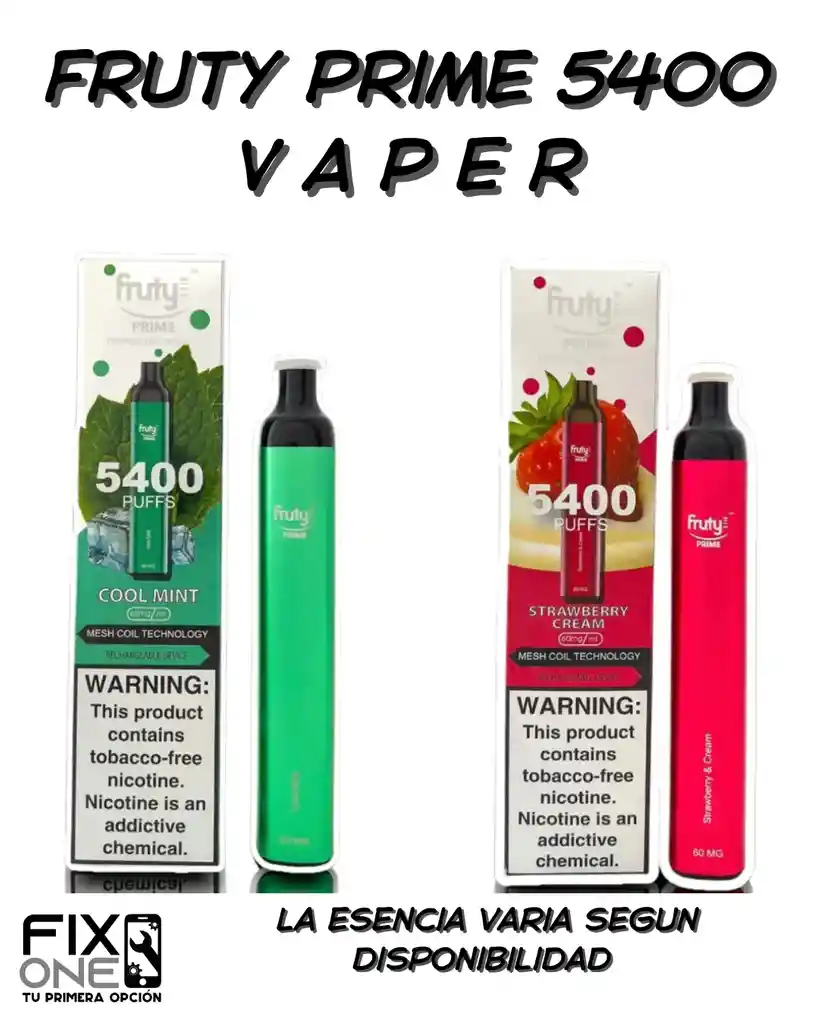 Los sabores varian segun disponibilidad Fruty Prime 5400 es un dispositivo desechable con un tamaño compacto y de bolsillo que lo hace fácil de transportar. Funciona con una batería incorporada de excelente calidad y viene con una cápsula precargada de su sabor preferido. Desde la primera inhalación, experimenta una increíble explosión de sabor que realmente hará de una experiencia UNICA. 60 mg de nicotina (6.0) CARACTERÍSTICAS: *60mg (6.0%) de sales de nicotina. *12ml de líquido precargado. *Batería recargable integrada de 750 mAh. *Puerto de carga Tipo C. *Vape desechable: al acabarse el líquido se debe desechar el dispositivo. Contenido: 1 unidad . La esencia varia segun disponibilidad. Prohibida la venta a menores de edad. Producto nocivo para la salud que contiene nicotina, sustancia altamente adictiva. Antes de consumir consulte las indicaciones y contraindicaciones de uso