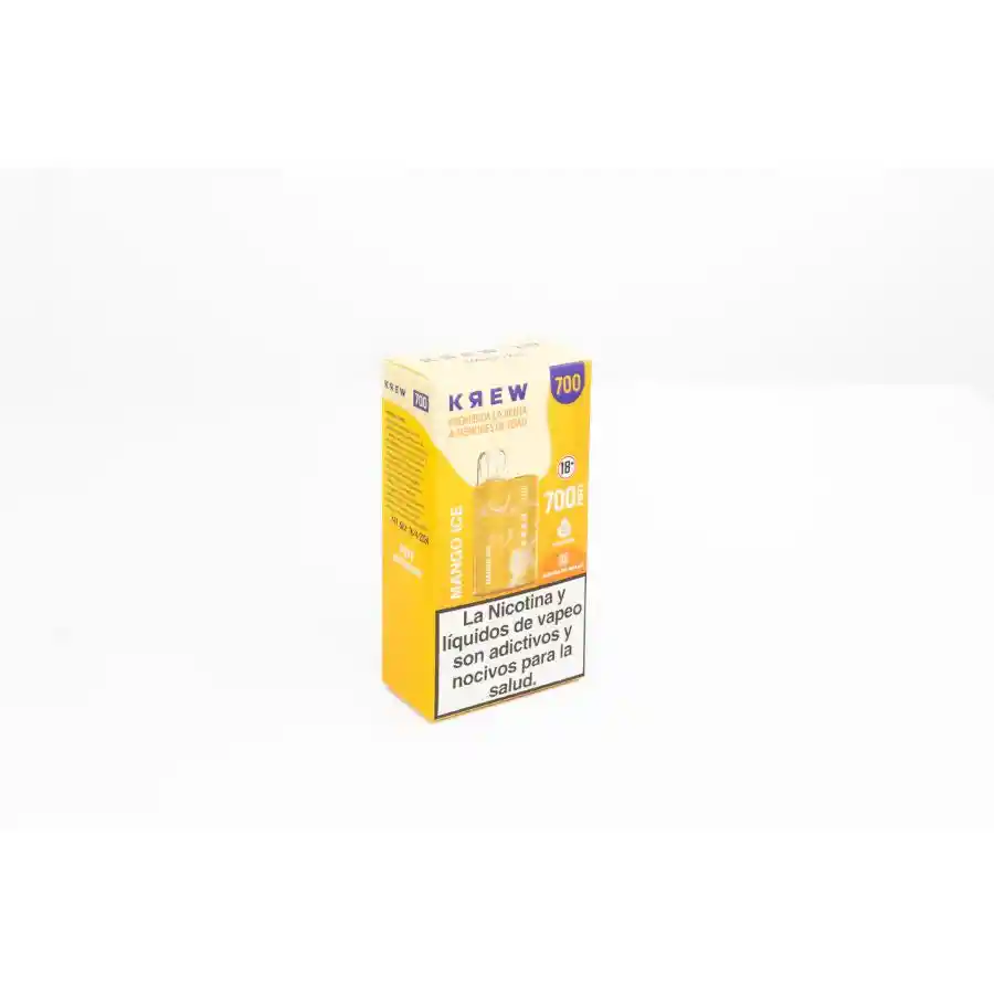 Vaper KREW 30G para 700 pufs de diferentes aromas. INSTRUCCIONES: este producto esta diseñado para usarse con varias concentraciones de e-liquid; si entra en contacto directo con dicho liquido mientras usa este producto, lávese bien las manos y los antebrazos. La exposición a dicho liquido puede ser perjudicial si entra en contacto con los ojos, en cuyo caso enjuáguese los ojos con agua y busque atención medica. En caso de ingestión, enjuáguese la boca y busque atención medica inmediata. ADVERTENCIA: Este producto contiene nicotina, mantener fuera del alcance de menores, mujeres embarazadas o lactando, animales, personas con o en riesgo de padecer enfermedades cardiacas, presión arterial alta, diabetes o tomen medicamentos para la depresión o asma. Almacenar a una temperatura entre 18-30 grados centígrados y fuera de la luz solar directa. No refrigere, congele, ni caliente el producto. Diseñado para ser utilizados por adultos mayores de edad legal para fumar. ESPECIFICACION: Tamaño 63*33*19mm Capacidad de E-liquid: 2.0 ml Capacidad de la batería: 400mah puff o Usos: hasta 700+ Bobina: Bobina de malla. Nicotina: 30mg/ml Aromas: Mango ice. Prohibida la venta a menores de edad. La nicotina y líquidos de vapeo son adictivos y nocivos para la salud.