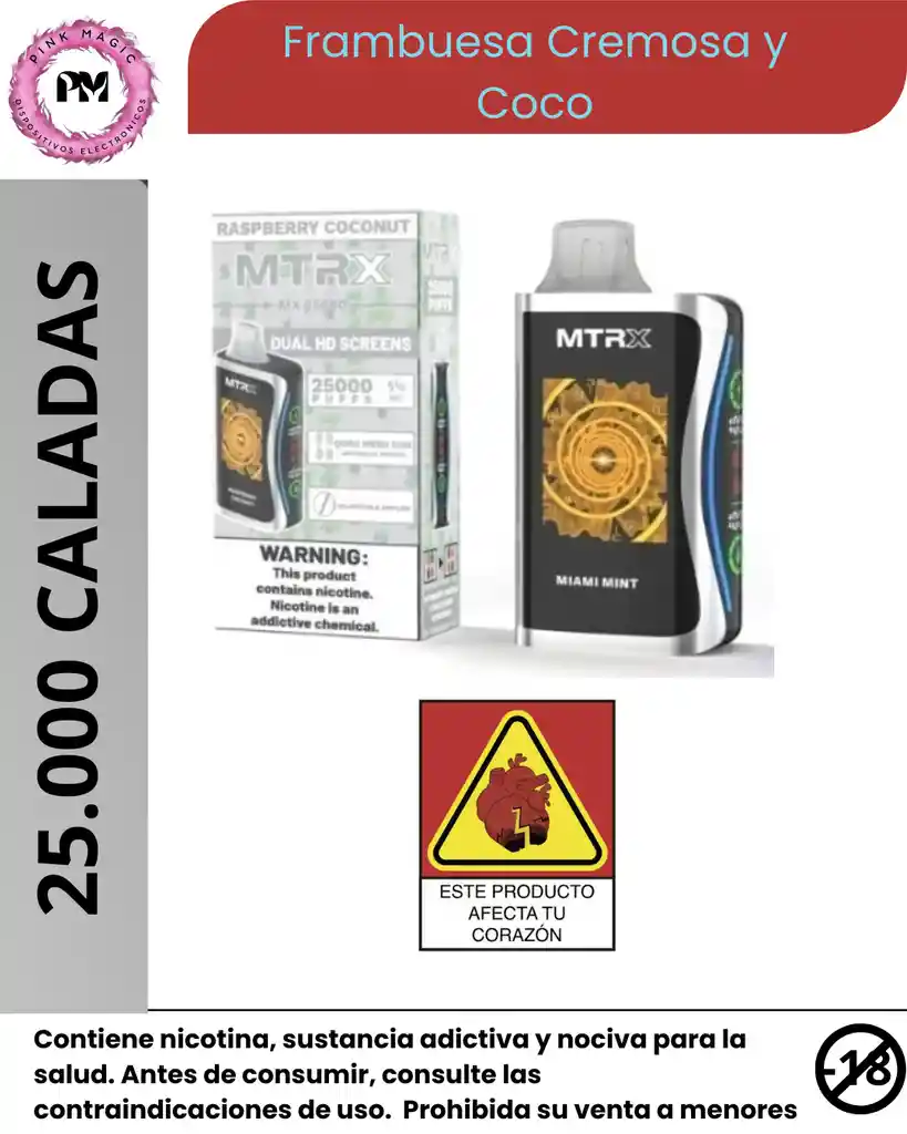 Vaper Matrix 25.000 Puffs Raspberry Coconut El MTRX es un vapeador recargable de última tecnología, diseñado para ofrecer hasta 25,000 inhalaciones con una carga. Con un nivel de nicotina del 5%, su potente batería y sistema de interfaz digital, brinda una experiencia de vapeo óptima.
