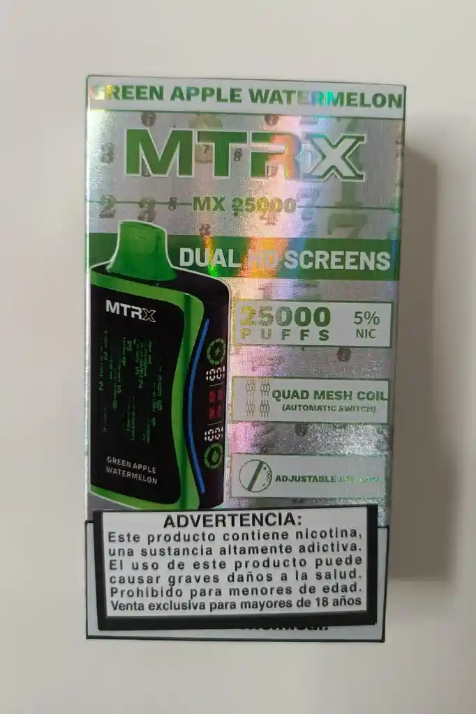 Descubre el vaporizador desechable MTRX MX25000, que revoluciona el vapeo con su capacidad de 25 000 caladas y sus innovadoras funciones. Con un diseño elegante y un depósito de e-líquido de 20 ml, ofrece potentes dosis de nicotina tanto para exfumadores como para vapeadores experimentados. Disfruta de la rápida carga tipo C y de una batería de 900 mAh de larga duración. Su sistema de resistencia de malla cuádruple garantiza una producción de vapor constante y un sabor excepcional. Las dos pantallas HD ofrecen atractivas animaciones y estadísticas en tiempo real, mientras que el flujo de aire ajustable adapta cada calada a tus preferencias. Disfruta de la comodidad, la durabilidad y la personalización con el MTRX MX25000. Características principales E-líquido precargado de 20 ml Concentración de nicotina del 5 % (50 mg) Batería recargable tipo C de 900 mAh Aproximadamente 25.000 bocanadas Bobina de malla cuádruple Cambia automáticamente las bobinas duales cada 10 segundos Pantalla dual HD 3 animaciones únicas de vapeo La pantalla del panel lateral muestra el porcentaje de batería y e-líquido Flujo de aire ajustable Saborea la combinación de fresas dulces, manzanas crujientes y la frescura jugosa de la sandía, para una experiencia deliciosa y refrescante en cada puff.
