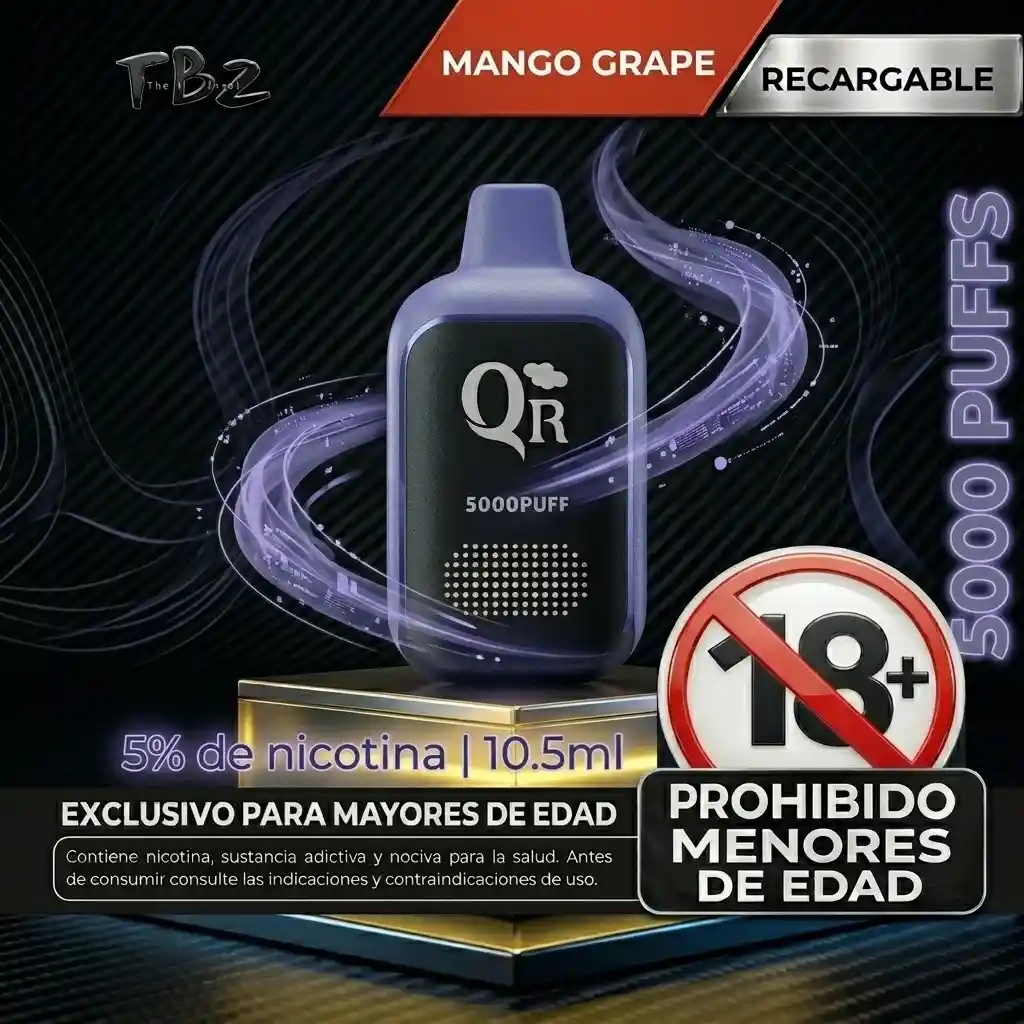Vaper Qr, sabor MANGO GRAPE, de 5000 puff - ( 5%) nicotina, capacidad: 10.5ml. Dispositivo recargable.