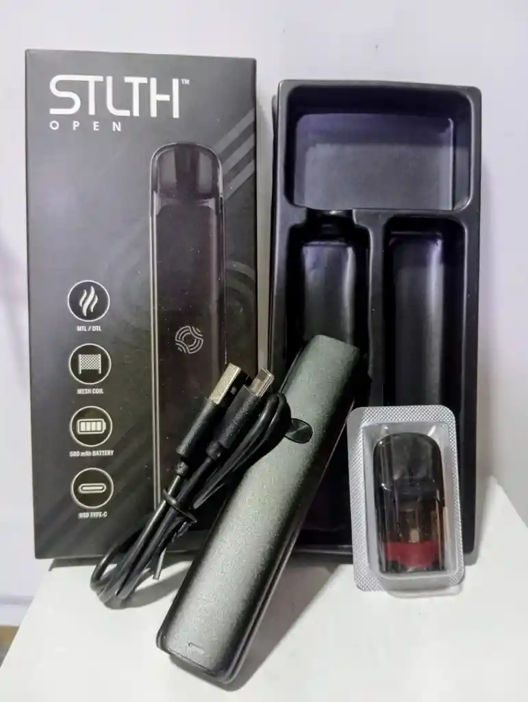 Vaper STLTH OPEN recargable, viene con su respectivo cartucho para dar caladas y una carga en esencia liquida de 5ML