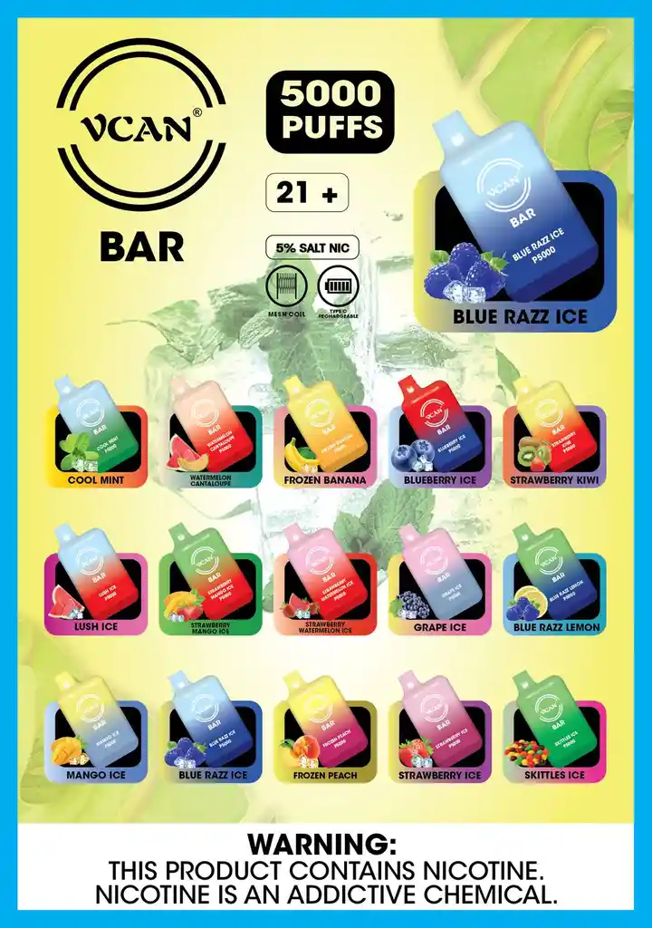 VAPER V-CAN BAR / 5% NIC /RECARGABLE / 5.000 PUFF / SKITTLES ICE 5% NICOTINA MENTOLADO Prohibida la venta a menores de edad. Producto nocivo para la salud que contiene nicotina, sustancia altamente adictiva. Antes de consumir consulte las indicaciones y contraindicaciones de uso