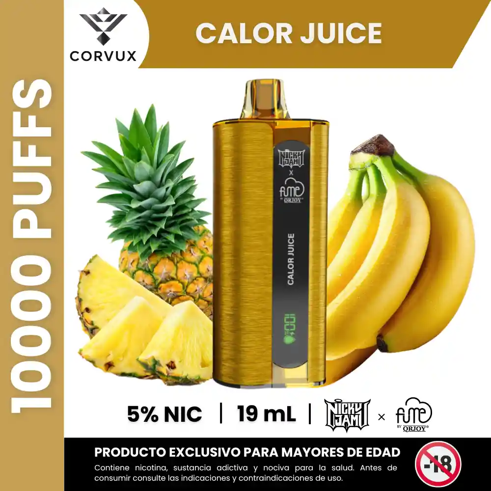 PROHIBIDA LA VENTA A MENORES DE EDAD. PRODUCTO EXCLUSIVO PARA MAYORES DE EDAD, CONTIENE NICOTINA, SUSTANCIA ADICTIVA Y NOCIVA PARA LA SALUD. ANTES DE CONSUMIR, CONSULTE LAS INDICACIONES Y CONTRAINDICACIONES DE USO. El Fume Nicky Jam 10000 Puffs - Calor Juice, presenta un perfil frutal-tropical inspirado en mezclas cítricas dulces, con una sensación fresca que acompaña toda la experiencia. ✨ Perfil del sabor ✦ Notas principales: Mezcla de frutas tropicales dulces con predominio cítrico, recordando combinaciones tipo piña, mango y jugos de cítricos maduros. ✦ Contrastes: El dulzor tropical se equilibra con una acidez ligera, acompañada de un matiz refrescante que mantiene el perfil limpio y evita una sensación empalagosa. ✦ Experiencia sensorial: Durante la inhalación se percibe una entrada frutal intensa, con vapor de densidad media-alta generado por su sistema de mesh coil, ofreciendo una distribución uniforme del sabor en el paladar. El golpe en garganta es medio, acorde a los niveles típicos de nicotina del dispositivo, sin resultar abrupto. En la exhalación, las notas cítricas se vuelven más presentes mientras el dulzor tropical se suaviza, dejando un retrogusto fresco y jugoso. El flujo de aire estable mantiene una calada constante durante toda la vida útil del dispositivo. ✦ Ideal para: Usuarios que prefieren perfiles frutales-tropicales con matices cítricos, en un dispositivo de autonomía extendida y producción de vapor consistente. 📋 Especificaciones técnicas ✦ Capacidad de e-líquido: 19 mL (pre-llenado) ✦ Nivel de nicotina: 5 % (≈ 50 mg/mL) — nicotina tipo sal ✦ Puffs estimados: Hasta 10 000 puffs (aprox., según uso y flujo de aire) ✦ Batería: 650 mAh 🔋 — recargable vía USB Tipo-C ⚡ ✦ Pantalla / Indicadores: Indicador LED de nivel de batería y e-líquido ✦ Resistencia (coil): Malla (mesh coil) para distribución uniforme de vapor ✦ Activación: Automática por succión (draw-activated) ✦ Flujo de aire: Fijo o con regulación mínima PROHIBIDA LA VENTA A MENORES DE EDAD. PRODUCTO EXCLUSIVO PARA MAYORES DE EDAD, CONTIENE NICOTINA, SUSTANCIA ADICTIVA Y NOCIVA PARA LA SALUD. ANTES DE CONSUMIR, CONSULTE LAS INDICACIONES Y CONTRAINDICACIONES DE USO.