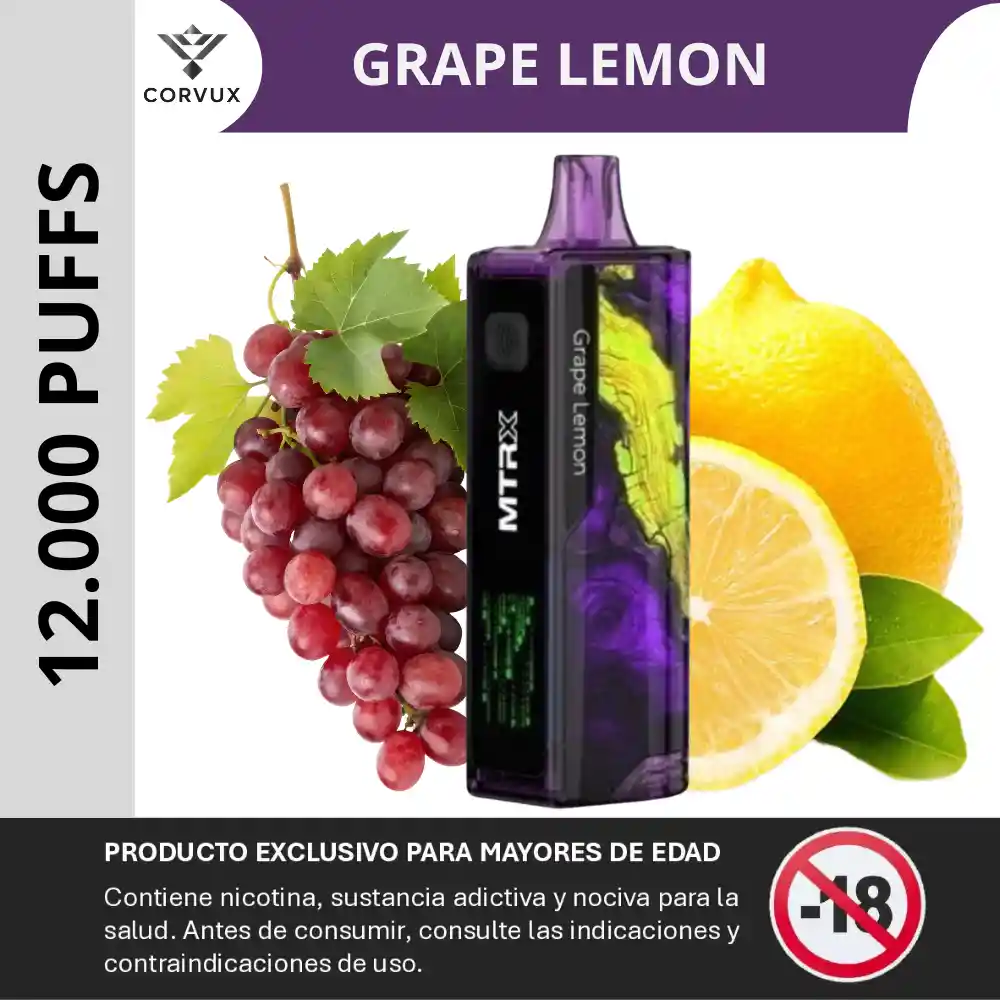 PROHIBIDA LA VENTA A MENORES DE EDAD. PRODUCTO EXCLUSIVO PARA MAYORES DE EDAD, CONTIENE NICOTINA, SUSTANCIA ADICTIVA Y NOCIVA PARA LA SALUD. ANTES DE CONSUMIR, CONSULTE LAS INDICACIONES Y CONTRAINDICACIONES DE USO. El MTRX 12000 Puffs Grape Lemon es un dispositivo de vapeo desechable recargable diseñado para ofrecer hasta 12 000 caladas con una sola carga, integrando una batería recargable USB-C y una pantalla digital que muestra nivel de batería y líquido. Forma parte de la línea MTRX 12k, conocida por combinar rendimiento prolongado con funciones personalizables. ✨ Perfil del sabor ✦ Notas Principales: Mezcla de sabores dulces de uva con cítricos de limón, creando un perfil frutal vibrante y aromático. ✦ Contrastes: El dulzor de la uva se equilibra con la acidez del limón, aportando un contraste refrescante y dinámico que evita que el sabor sea monótono. ✦ Experiencia Sensorial: Cada calada presenta una sensación frutal clara con un toque cítrico que realza la vivacidad del sabor, generando un perfil balanceado y fácil de percibir. ✦ Ideal para: Adultos que buscan un perfil frutal con matices cítricos en un formato cómodo, de uso prolongado y con controles personalizables. 📋 Especificaciones técnicas ✦ Capacidad de caladas: Hasta 12 000 puffs con una sola carga. ✦ E-líquido precargado: ~15 ml. ✦ Concentración de nicotina: 5 % (50 mg). ✦ Batería: ~650 mAh recargable mediante puerto USB-C. ✦ Pantalla: HD con indicadores de batería, nivel de e-líquido y modo. ✦ Modos de vapeo: Regular y Boost para variar intensidad. ✦ Flujo de aire: Ajustable para personalizar la resistencia de la calada. PROHIBIDA LA VENTA A MENORES DE EDAD. PRODUCTO EXCLUSIVO PARA MAYORES DE EDAD, CONTIENE NICOTINA, SUSTANCIA ADICTIVA Y NOCIVA PARA LA SALUD. ANTES DE CONSUMIR, CONSULTE LAS INDICACIONES Y CONTRAINDICACIONES DE USO.
