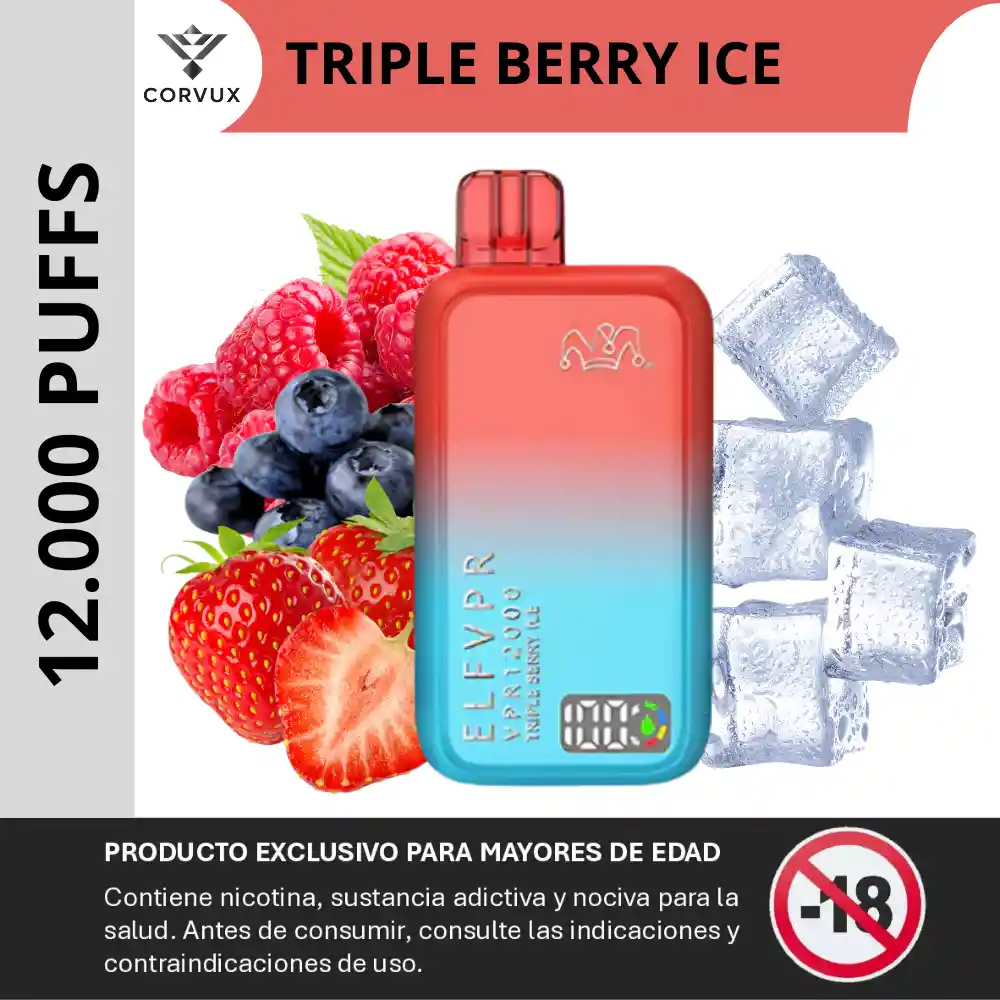 PROHIBIDA LA VENTA A MENORES DE EDAD. PRODUCTO EXCLUSIVO PARA MAYORES DE EDAD, CONTIENE NICOTINA, SUSTANCIA ADICTIVA Y NOCIVA PARA LA SALUD. ANTES DE CONSUMIR, CONSULTE LAS INDICACIONES Y CONTRAINDICACIONES DE USO. El ELF VPR 12000 Puffs - Triple Berry Ice, combina una mezcla de tres frutos rojos (frambuesa, arándano y fresa) con un toque frío mentolado, resultando en un perfil frutal-refrescante que equilibra dulzor y frescura en cada calada. ✦ Notas principales: Frutas rojas mixtas: combinación de fresa, arándano y frambuesa. Frescura mentolada: sensación fría integrada de forma balanceada. ✦ Contrastes: La mezcla de frutos rojos busca un equilibrio entre dulzor frutal y acidez suave, complementada por la frescura mentolada, resultando en un perfil que no es excesivamente dulce ni intensamente frío. ✦ Experiencia sensorial: Al inhalar: el sabor frutal de las berries se percibe de forma clara y definida, con una sensación jugosa y ligeramente ácida. Golpe en garganta: medio, acorde con la concentración estándar de sales de nicotina al 5 %. Al exhalar: la frescura mentolada se intensifica gradualmente, dejando un retrogusto frutal-fresco que persiste sin opacar los matices de fruta. La estabilidad del sabor se mantiene relativamente uniforme durante la duración del e-líquido debido a la configuración técnica del dispositivo. ✦ Ideal para: Usuarios que prefieren un perfil frutal ácido-dulce con un toque frío, donde las notas de frutos rojos se combinan con frescura moderada en un vape de autonomía considerable. ⚙️ Especificaciones técnicas: ✦ Caladas estimadas: ~12 000 puffs ✦ E-líquido prellenado: 18 ml ✦ Batería: 620 mAh recargable (USB-C) ✦ Nicotina: 5 % (50 mg) ✦ Pantalla LED para nivel de e-líquido y batería ✦ Protección anti-dry-burn ✦ Activación por calada (draw-activated) PROHIBIDA LA VENTA A MENORES DE EDAD. PRODUCTO EXCLUSIVO PARA MAYORES DE EDAD, CONTIENE NICOTINA, SUSTANCIA ADICTIVA Y NOCIVA PARA LA SALUD. ANTES DE CONSUMIR, CONSULTE LAS INDICACIONES Y CONTRAINDICACIONES DE USO.