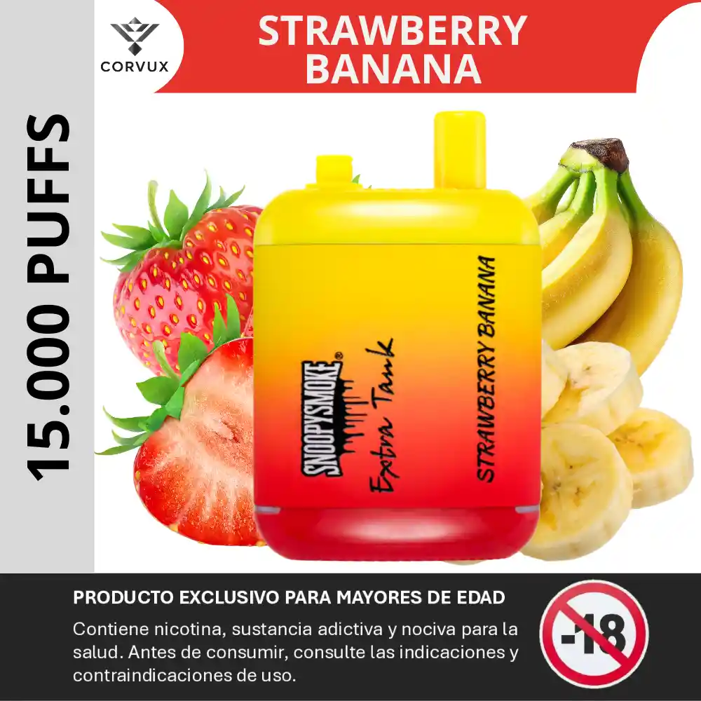 PROHIBIDA LA VENTA A MENORES DE EDAD. PRODUCTO EXCLUSIVO PARA MAYORES DE EDAD, CONTIENE NICOTINA, SUSTANCIA ADICTIVA Y NOCIVA PARA LA SALUD. ANTES DE CONSUMIR, CONSULTE LAS INDICACIONES Y CONTRAINDICACIONES DE USO. El Snoopy Smoke 15000 Strawberry Banana es un dispositivo de vapeo desechable de doble tanque diseñado para uso prolongado, con capacidad para ofrecer más de 15 000 caladas en un formato compacto y fácil de usar. El sistema de dos tanques precargados permite cambiar de uno a otro cuando se agotan, extendiendo la duración total sin necesidad de rellenar. ✨ Perfil del sabor ✦ Notas Principales: Predomina una combinación de fresa madura y banana cremosa, con un balance clásico de estos sabores frutales que aporta dulzor y profundidad. ✦ Contrastes: El dulzor jugoso de la fresa se equilibra con matices suaves y cremosos de banana, evitando que el perfil resulte demasiado empalagoso y aportando complejidad al conjunto. ✦ Experiencia Sensorial: Cada calada ofrece una sensación frutal definida y balanceada, con notas de fresa brillante seguidas de un toque cremoso de banana que hace que el perfil sea suave y fácil de disfrutar. ✦ Ideal para: Adultos que prefieren perfiles frutales clásicos con mezcla de sabores dulces, en un dispositivo de vapeo duradero y sencillo de usar. 📋 Especificaciones técnicas ✦ Caladas aproximadas: Caladas aproximadas: Más de 15 000 puffs con una sola unidad. ✦ Capacidad de e-líquido: 36 ml en total (dos tanques de 18 ml cada uno). ✦ Concentración de nicotina: 5 % (50 mg) de sales de nicotina. ✦ Batería: 650 mAh, recargable mediante USB-C. ✦ Sistema de tanques: Dual Tank, permite cambiar de tanque cuando uno se agota. ✦ Coil / Calentador: Malla (mesh coil) para producción constante de vapor. ✦ Funcionamiento: Activación por tiro (draw-activated), sin botones adicionales. PROHIBIDA LA VENTA A MENORES DE EDAD. PRODUCTO EXCLUSIVO PARA MAYORES DE EDAD, CONTIENE NICOTINA, SUSTANCIA ADICTIVA Y NOCIVA PARA LA SALUD. ANTES DE CONSUMIR, CONSULTE LAS INDICACIONES Y CONTRAINDICACIONES DE USO.